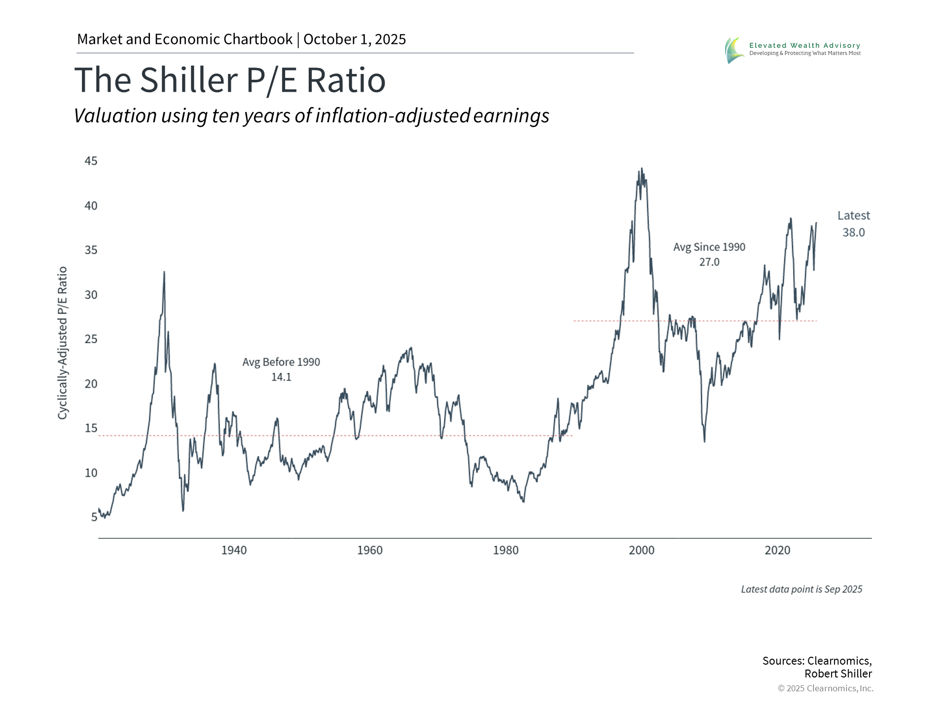 One of the most important considerations for long-term investors is the level of valuations for the overall market. Rather than simply focusing on the price of the market, valuations tell us what we’re getting for that price in terms of earnings, cash flow, sales, dividends, and other corporate fundamentals. While high valuations suggest that investors are optimistic, they also imply that expectations may be too lofty in some parts of the market. The accompanying chart demonstrates this with the Shiller price-to-earnings ratio for the S&P 500. The current value of 38x is well above the 35-year average of 27x and is approaching levels last seen during the dot-com bubble. This measure provides a longer-term perspective than standard P/E ratios by using a ten-year history of earnings, adjusted for inflation. The fact that valuations are at these levels should not be surprising given the strong rebound of the past two quarters. The S&P 500 has climbed 34% since April 8, resulting in a double-digit gain for the year. Technology stocks across various sectors have led the market on the way up, just as they led it on the way down. The Magnificent 7 stocks, for instance, have risen 61% since the bottom. While investors are increasingly questioning whether corporate spending on artificial intelligence will generate a positive return, the reality is that this has been a key driver of the broader market and business investment. It's important to note that valuations don't predict short-term market movements and are not market timing tools. Instead, they serve as core inputs into the asset allocation process. While broad market valuations are elevated, this is not the case across all parts of the market. For example, small-caps, value stocks, and international stocks have more attractive valuations than large-caps, growth stocks, and U.S. stocks at the moment. This can create opportunities for investors with a broader perspective and longer time horizons. The Fed is cutting rates amid job market weakness