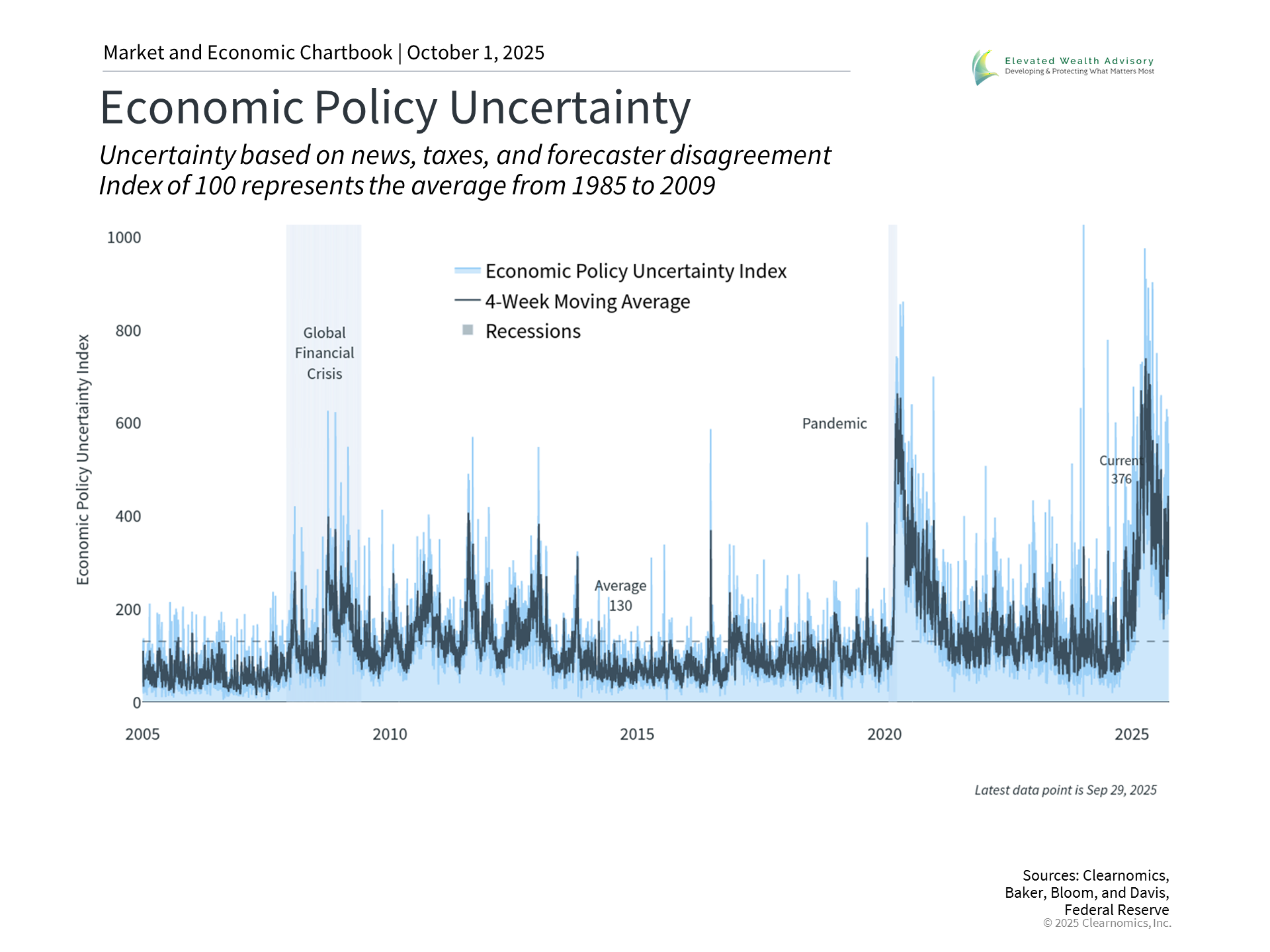 After significant volatility driven by tariffs and taxes earlier this year, measures of economic policy uncertainty have improved. The VIX index of stock market volatility is hovering around 16.3, below the long run average of 18, while the MOVE index of bond market volatility has declined to 78, below the average of 87. As many long-term investors know, periods of market calm can change quickly. The last several years have experienced many episodes of heightened volatility due to inflation, trade wars, Washington policy, the Fed, recession fears, geopolitical conflicts, and more. The current government shutdown is but the latest event that could rattle markets in the short run, even if the long run effects are limited. Similarly, the outcome of tariff policies and the impact on inflation remain uncertain. For investors, this uncertainty may feel uncomfortable, but it's also what drives long-term portfolio outcomes. The last several years also highlight the difference between what investors feared and how markets actually performed. Rather than viewing uncertainty as something to avoid, successful long-term investors recognize it as a feature of markets that creates the opportunity to position portfolios for the years ahead. The bottom line? As the final quarter of the year begins, markets are near all-time highs amid conflicting economic signals. This environment underscores the importance of maintaining an appropriate asset allocation and staying focused on financial goals. | |||