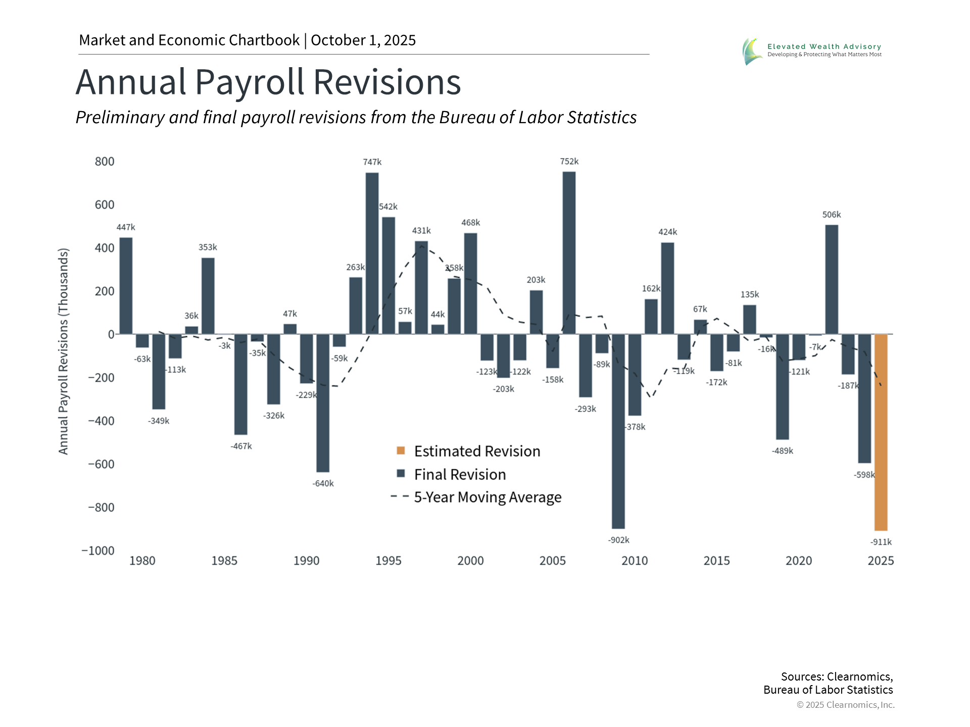 The Federal Reserve cut interest rates by 0.25% in September 2025, resuming its easing cycle after holding rates steady through much of the year. This decision reflects the Fed's attempt to balance stubborn inflation that remains above the 2% target with a weakening labor market. This rate cut was widely expected and has served as a tailwind for markets in recent months. There are many factors that make this cutting cycle unique. Historically, the Fed has been forced to cut rates in response to economic crises or recessions. While there are some signs of weakness today, overall growth remains healthy. So, recent cuts represent something different: an attempt to normalize policy after the rapid tightening cycle that began in 2022. This is one reason the Fed is easing policy even while the economy remains in expansion and markets trade at all-time highs. Perhaps the most important factor driving the Fed's decision has been the deterioration in the job market. While the unemployment rate of 4.3% remains low by historical standards, the pace of job creation has slowed dramatically. August saw only 22,000 new payrolls added, well below the average of 123,000 from earlier in the year. Even more striking are the payroll revisions suggesting that 911,000 fewer jobs were created over the twelve months through March than originally reported, as shown in the chart above. The Bureau of Labor Statistics revises the payroll numbers each year based on more accurate data than was available at the time of each monthly jobs report. While the numbers are still preliminary, a revision of this magnitude would represent the largest in history, showing that the job market has been weaker than originally believed. Thus, the Fed is cutting rates because, according to the latest FOMC statement, it “judges that downside risks to employment have risen.” For investors, rate cuts typically provide support for both stocks and bonds if the economy remains strong. Market volatility and policy uncertainty have eased for now