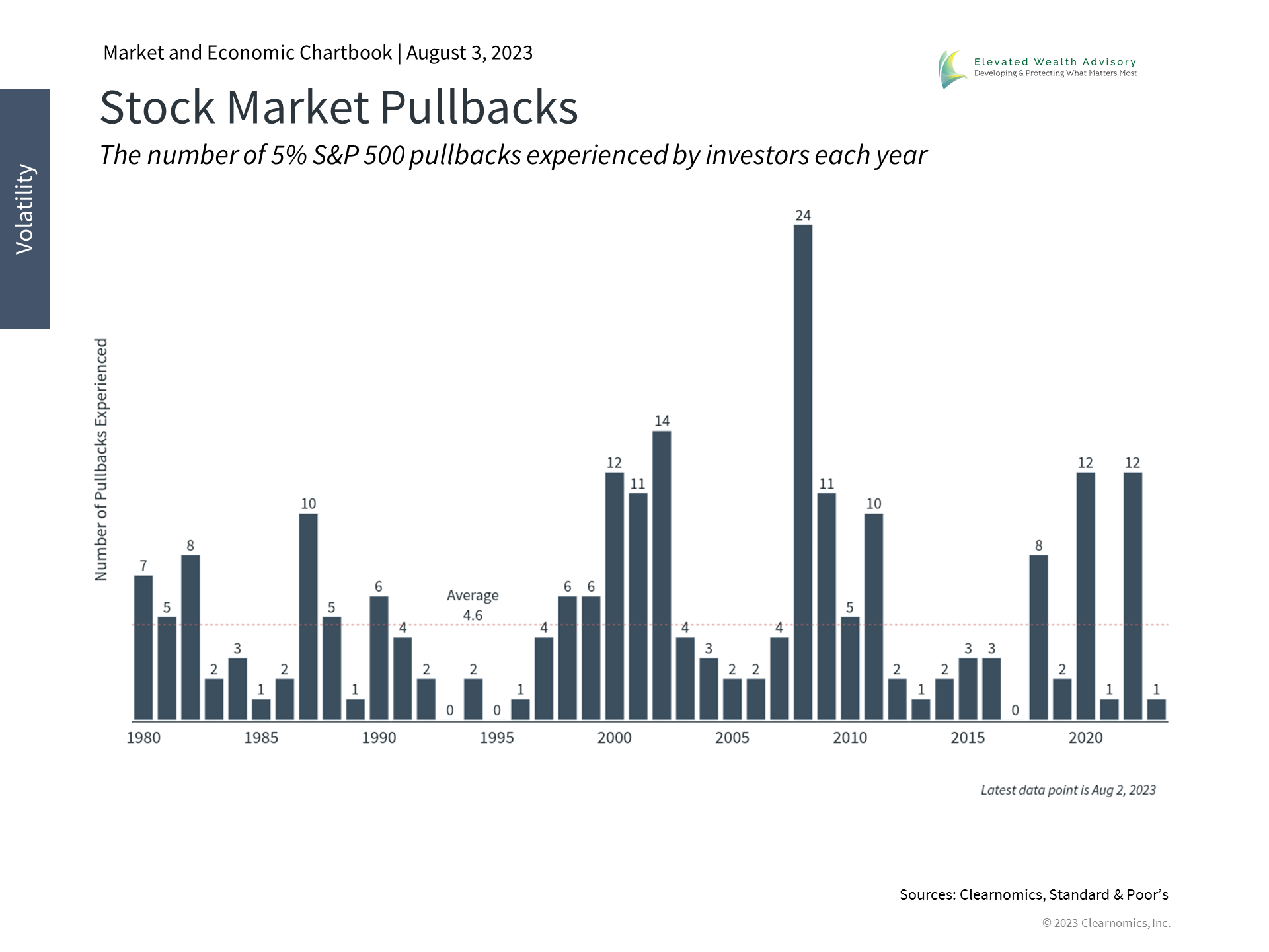 So, what does the latest U.S. debt downgrade mean for investors? In truth, nothing has changed in recent weeks regarding the health of the economy or the long-term fiscal situation for the country. Given how heated the topic of federal spending can be, it's important for investors to distinguish between their political feelings and how they manage their portfolios. Investors should always be prepared for periods of market uncertainty, especially given the low level of volatility this year. The accompanying chart shows that there has only been one pullback of 5% or worse this year which occurred in March during the banking crisis, compared to the average year which experiences several. Two long-term debt concerns that some investors often have are the growing interest payments on the national debt and the reliance on foreign borrowing. Neither has a simple solution. The fact that interest rates have been and remain relatively low compared to history has helped to keep these payments manageable. Deficit levels, and the growth of the national debt, will also naturally improve as the economy recovers. When it comes to our foreign dependency, over 75% of the U.S. debt is still held by American households and institutions, compared to foreign holdings of 3.5% by Japan, 2.7% by China, 2.1% by the U.K., and so on. While this is an issue that matters from the perspective of fiscal responsibility, it is unlikely to be something that should drive portfolio decisions. The national debt and the fiscal standing of the U.S. matter for many reasons. But from an investment perspective, the irony is that the best times to invest have been when the deficit has been the worst. This is because government spending increases - both in absolute terms and relative to GDP - during recessions and crises. In hindsight, these periods coincide with the most attractive prices and valuations. Ultimately, history shows that investors are rewarded for investing when others are fearful. The bottom line? Although the Fitch downgrade is impacting markets, it is based on factors with which investors are already familiar. As with many political issues, it's important for investors to separate their concerns and not react with their hard-earned savings and investments. | |||