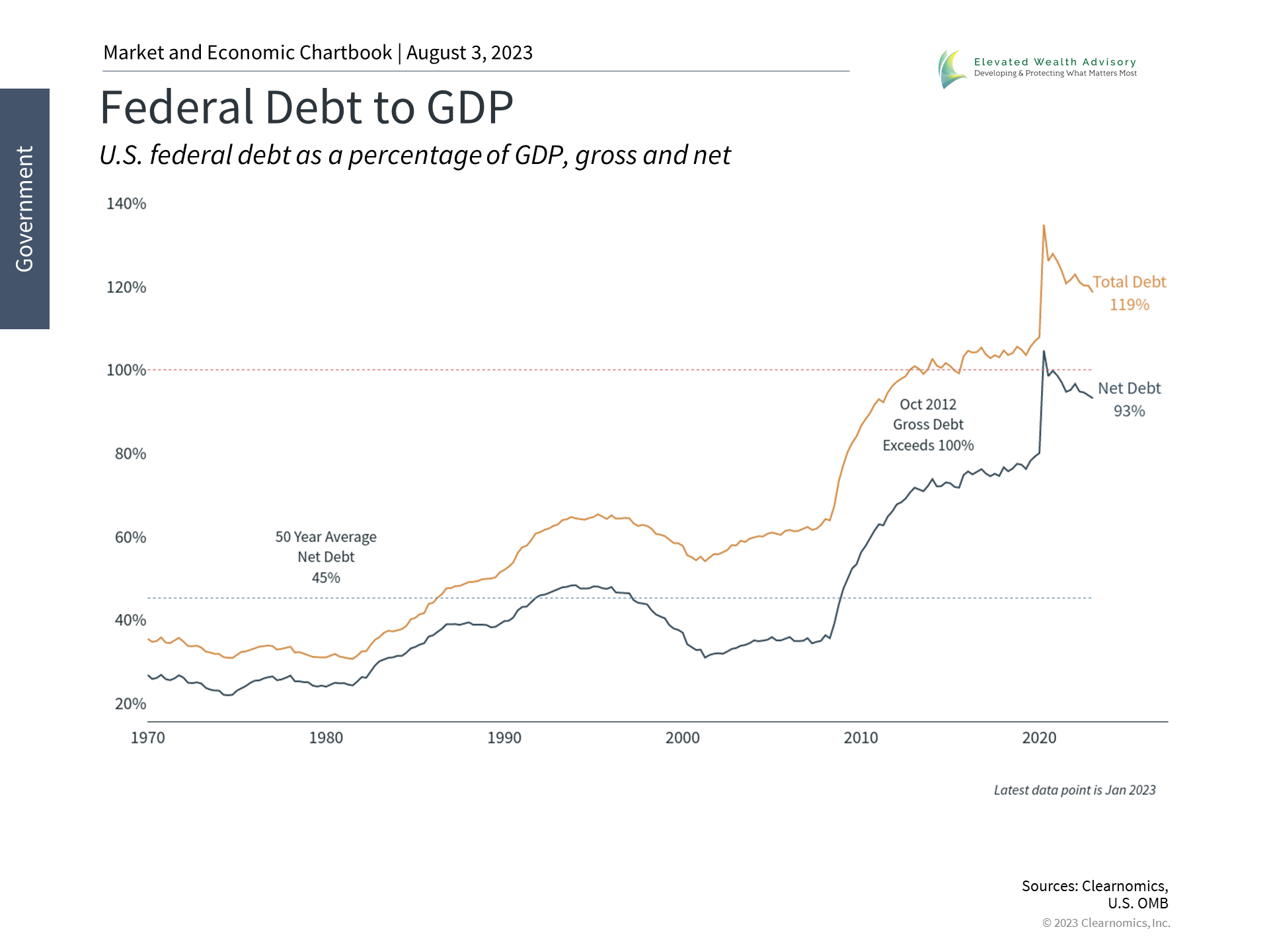 With investing, as in life, it's important to know not just what to worry about, but when to do so. The national debt is rightfully a source of investor worry but this has been the case for decades. As citizens and taxpayers, there are important ways to voice and act on these concerns. As investors, however, focusing too much on these issues, especially at the wrong times, can lead to poor financial and investment decisions in the worst case, and unnecessary anxiety in the best case. Understanding how these issues impact a properly constructed portfolio that meets the needs of a long-term financial plan is what's most important. It's no secret that the level of the national debt has grown considerably in recent years, from $9 trillion in 2008 to over $31 trillion today. As a percentage of GDP, debt levels have risen to nearly 120% in total and 93% if inter-governmental debt holdings are excluded (i.e., debt one part of the government owes to another). Regardless of how you slice it, debt levels have risen dramatically with little end in sight. This is largely due to periods of economic turmoil, especially the 2008 financial crisis and the 2020 pandemic, that required government stimulus. Unfortunately, there are few examples of the federal government not just running a balanced budget, but operating at a surplus. This last occurred during the dot-com boom under the Clinton administration and, before that, in the early 1970s under President Nixon. Fitch's downgrade reflects the fiscal and political climate with which investors are already familiar. While their decision was based on the familiar factors of worsening government revenues, Fed tightening, and the possibility of a recession, it was largely driven by the "repeated debt-limit political standoffs and last-minute resolutions" in Washington. This is important because it draws a distinction between the ability to pay the country's debts versus the willingness to do so. Most investors would likely agree that national politics has only grown more divisive over the past two decades. It has only been two months since the last debt ceiling standoff was resolved and the agreement only kicked the can down the road to January 2025. The U.S. now has ratings of AAA from Moody's, AA+ from Standard & Poor's, and AA+ from Fitch. Only nine countries, plus the European Union, maintain the top ratings across the three major credit ratings agencies, including Germany, Switzerland, Australia, and Singapore. Interest rates have jumped following the downgrade