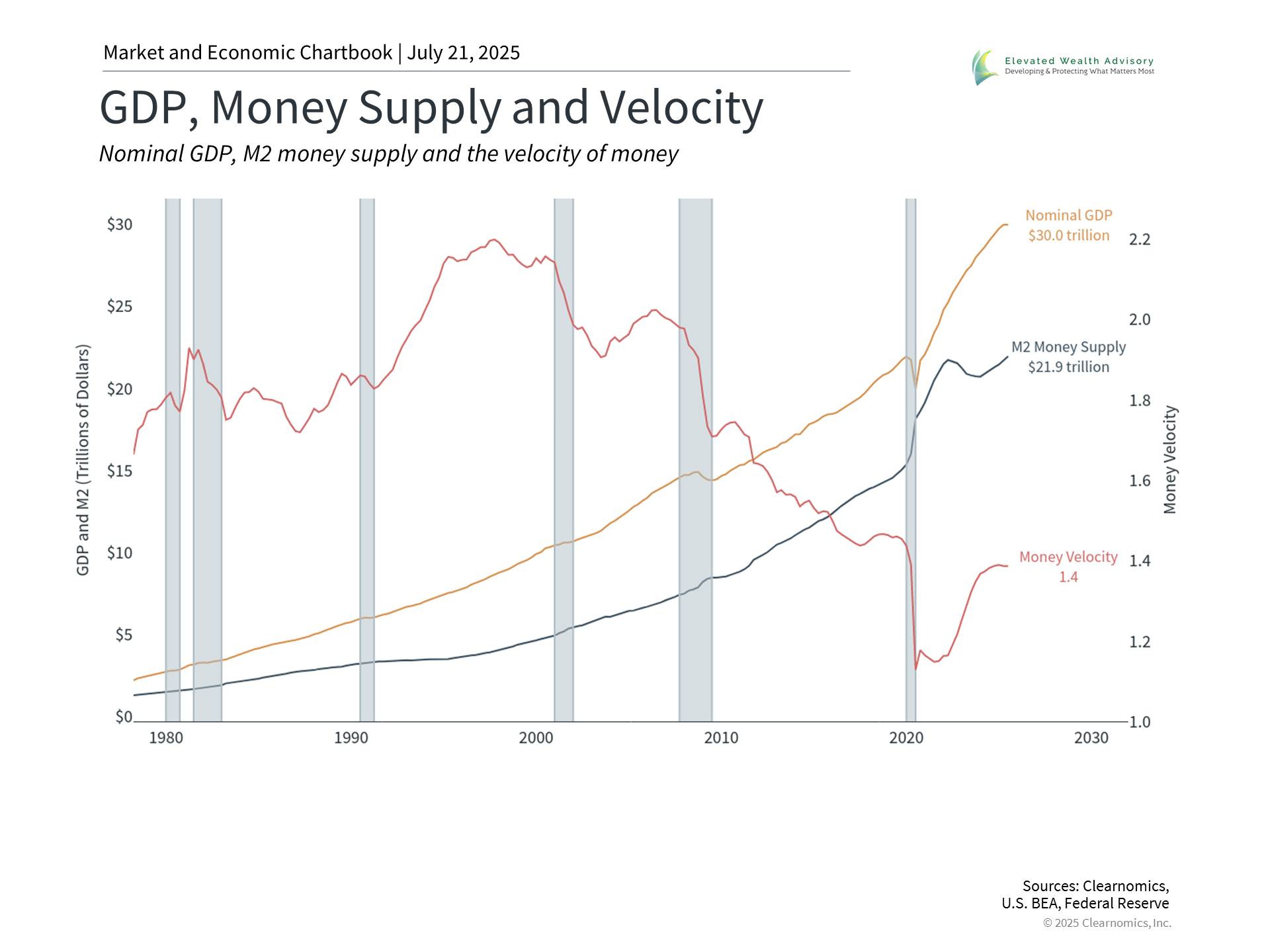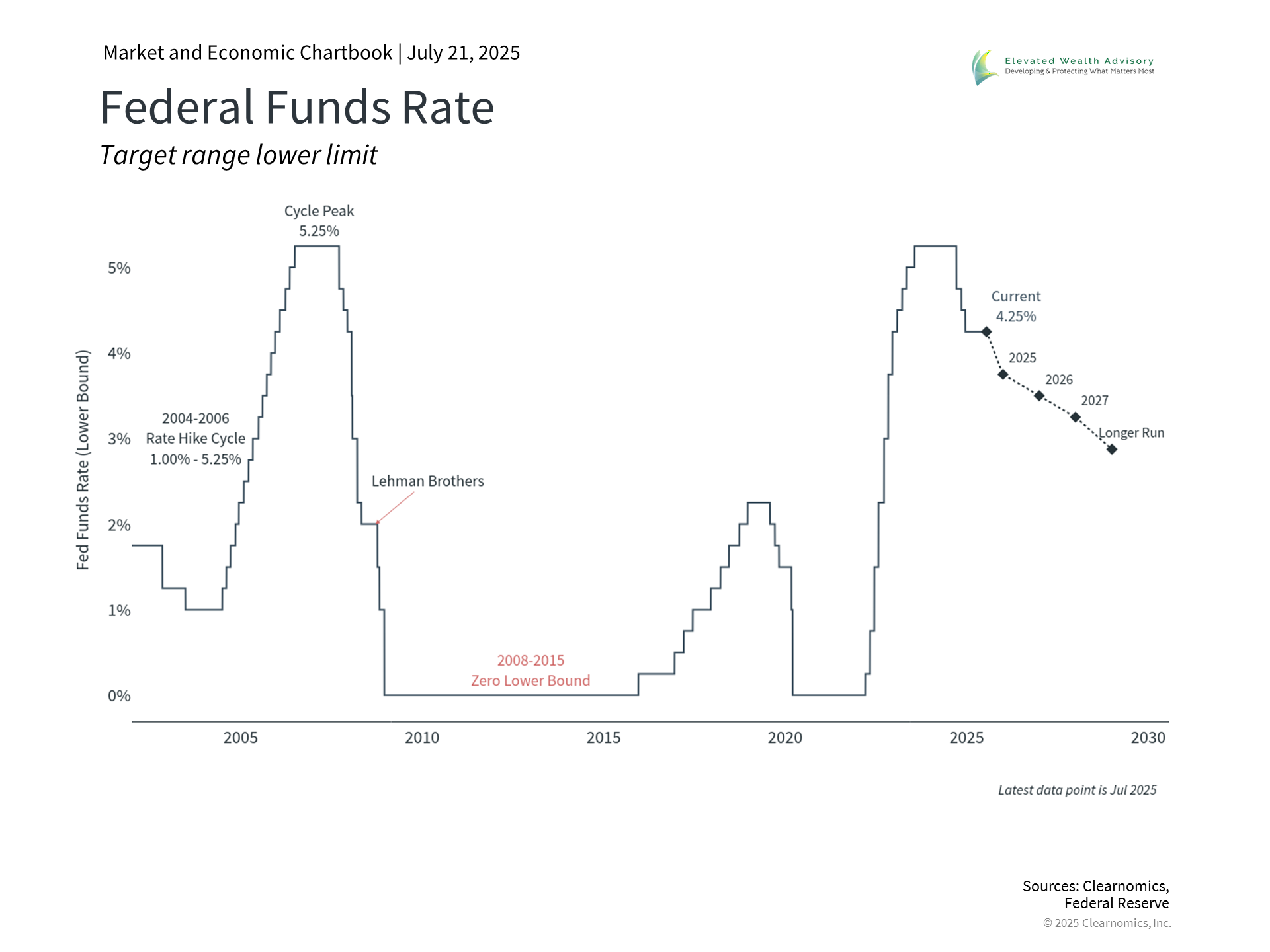 Perhaps the best parallel to today’s environment is the 1970s and early 1980s. Ahead of the 1972 election, President Nixon sought to ensure that easy monetary policy would support his campaign. Fed Chair Arthur Burns, who had been Nixon's economic advisor, accommodated this by loosening monetary policy, which economists believe contributed to the inflationary pressures of the following decade.1 It wasn’t until the early 1980s, under Paul Volcker, that the Fed regained control of inflation by causing a recession. While most economists agree this is what ended the “stagflation” of that period, it came with political challenges. In his memoir, Volcker recounted pressure from the Reagan administration to not raise rates before an election.2 In many ways, today’s economic environment echoes that of the 1970s since there are tensions between holding higher rates to ensure inflation improves, and lowering rates to spur growth. While inflation has been trending closer to the Fed's 2% target, headline CPI remains at 2.7% and core inflation at 2.9% according to the latest report. Additionally, the Fed is taking a “wait-and-see” approach on whether tariffs will raise prices for consumers. One way to understand this challenge is via the money supply, shown in the chart above. The money supply, which is managed by the Fed, typically increases steadily, supporting both stable growth and inflation. During crisis periods, such as in 2020, the money supply is used to support the economy. However, money supply growth has been flat in recent years as policymakers focused on combating inflation. Naturally, this can conflict with what some elected officials might prefer. The Fed is still expected to cut rates
