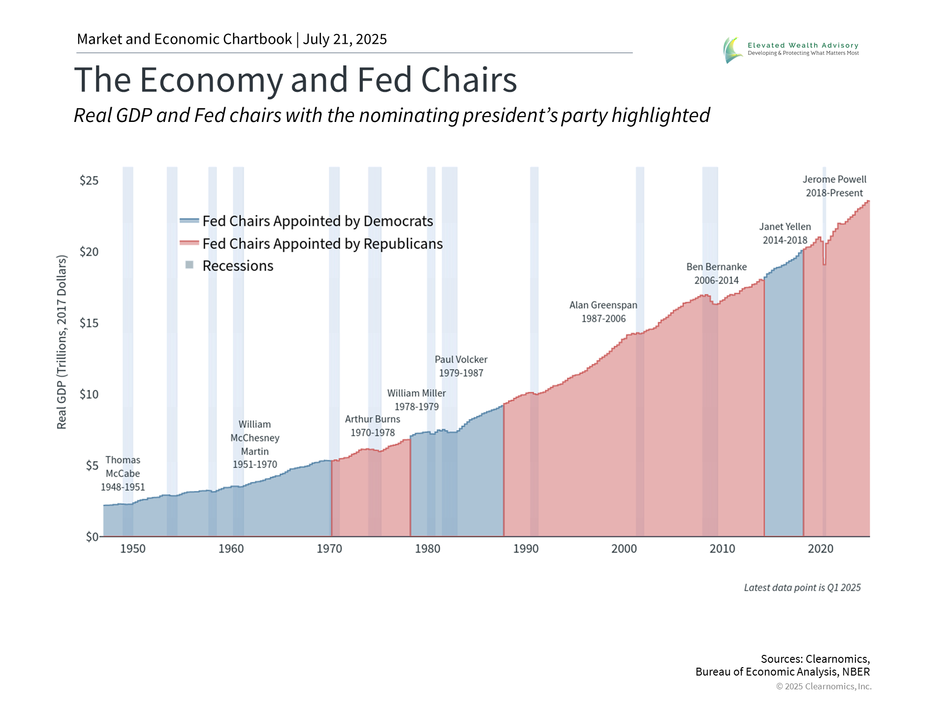 Politics aside, the Fed is expected to cut rates further this year. It has been on hold following several cuts in late 2024 due to uncertainty around tariffs. The reality is that Fed policy exists to support long-term growth trends. When the economy is strengthening, the Fed's job is to make sure it does not overheat – sometimes described as “taking the punch bowl away.” When the economy is weak, lower rates may be needed to jumpstart growth. This balancing act is challenging, even in the best of times. In hindsight, the Fed is often accused of being “behind the curve.” For instance, Alan Greenspan, who served as Fed Chair for nearly 20 years, did not properly react to the housing bubble forming at the end of his tenure. More recently, some argue that the Fed raised rates too slowly in 2022 when there was already clear evidence of inflation. What matters for investors and their portfolios is not to debate what the Fed should or should not have done. Instead, it’s to respond properly to the current investment environment with a long-term plan. History shows that changes in Fed leadership and shifts in policy can create uncertainty, but markets have performed well in spite of these challenges. The bottom line? The market and economy have performed well under many different monetary policy and political environments. Maintaining a long-term plan that can navigate this uncertainty is still the best way to achieve financial goals. 1. https://www.aeaweb.org/articles?id=10.1257/jep.20.4.177 2. Volcker, P. A. (2018). Keeping At It: The Quest for Sound Money and Good Government | |||