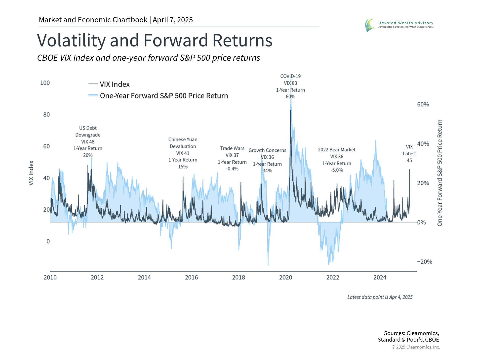 What about market opportunities? The accompanying chart shows that the VIX index, often known as the stock market’s “fear gauge,” can spike on a periodic basis. These peaks correspond to sharp drops in the market, such as in 2008 or 2020. These are times when markets are the most nervous and, in many cases, investors feel as if the situation will never stabilize. This chart also shows the returns of the S&P 500 over the next year. As we discussed above, there is never any certainty about returns over any single year for the stock market. However, it’s clear that the greatest market opportunities often emerge when investors are the most worried. This is the heart of the famous Warren Buffett quote to “be fearful when others are greedy, and greedy when others are fearful.” This is especially true if markets face liquidity rather than solvency concerns. Liquidity problems emerge when market declines force some investors - specifically those who use leverage, or borrowed funds - to sell other assets. In these situations, prices may decline even when the underlying fundamentals of an asset remain unchanged. These are classic cases where short-term market moves become disconnected from long-term outlooks, creating opportunities for patient investors. It's important to note that this is not an argument for market timing. Even when the VIX is high, there is no guarantee that markets will rebound quickly. Instead, investors should view this as additional support for taking a portfolio perspective. Market downturns often occur when valuations are the most attractive, and thus it can make sense to shift toward – not away – from these assets. Of course, what makes sense for a given portfolio depends on the specific circumstances. Valuations are more attractive today