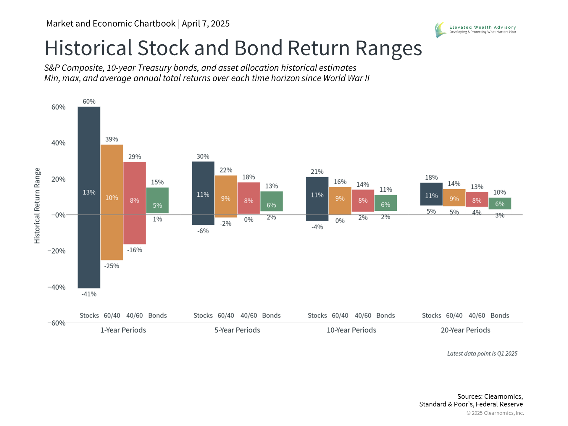 In sports as well as investing, a winning strategy requires a combination of both offense and defense. Defense involves maintaining a portfolio that can withstand different phases of the market cycle. Stock market uncertainty and unexpected life events are inevitable, so always being ready to play defense is important. Offense, on the other hand, involves taking advantage of market opportunities that emerge from changing conditions. The irony is that while periods of market uncertainty may be unpleasant, they also represent times when asset prices and valuations are the most attractive. Ultimately, portfolios that are tailored toward financial goals need both offense and defense. How can investors position in today’s market environment to both protect from risk and take advantage of opportunities? Two of the key principles of long-term investing are diversification and maintaining a long time horizon. This is showcased in the accompanying chart which depicts the range of historical outcomes across stocks, bonds, and diversified portfolios. It also shows how these ranges change when time horizons are increased. For instance, it’s easy to see that over just one-year periods, the stock market can vary significantly, from gaining 60% in 1983 when the market recovered from stagflation fears, to -41% during the global financial crisis. Moving beyond just one-year periods and a stock-only portfolio underscores why these are powerful ways to think about investing and financial planning. Diversifying might reduce the maximum returns an investor can experience, but it also reduces risk. This is evident in the balanced portfolio consisting of 60% stocks and 40% bonds. So far this year, the S&P 500 is 13% lower, but a 60/40 mix of these indices has declined only 4.6%. After all, the goal is not simply to grow a portfolio at the fastest but most volatile rate, but to have the highest possible probability of achieving your financial goals. A diversified portfolio historically has a much narrower range of outcomes, allowing investors to better plan toward their goals. Similarly, extending your time horizon by even a few years can have a significant impact on the range of outcomes. History shows that, since World War II, there has not been a 20-year period in which any of these assets and portfolios have experienced annual declines, on average. The same is true over 10-year periods for many diversified asset allocations. While this is only illustrative and is no guarantee of future performance, it clearly shows the importance of thinking long-term. Volatility can create opportunities