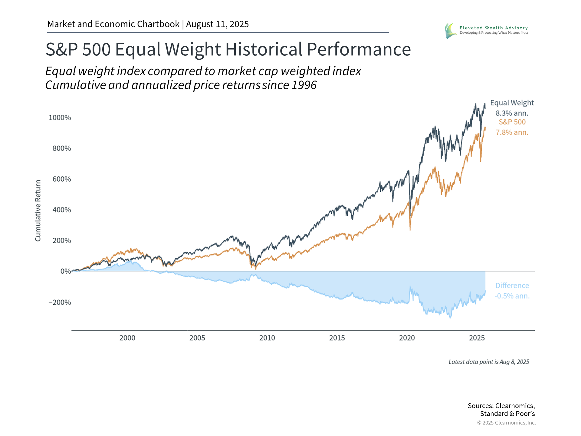 Similarly, while the Magnificent 7 companies may have led the market on the way up, they have also done so on the way down. For example, in 2022 when interest rates rose quickly due to inflation, these stocks dropped about 50% on average. Since the Magnificent 7 now represents such a large portion of major market indices, the reality is that nearly all investors have these stocks in their portfolios. For those who have focused on technology stocks, their portfolio allocations may be greater than intended. Holding too much of a portfolio in just a few investments is often known as “concentration risk,” and is the opposite of diversification. On the one hand, these companies have demonstrated growth and profitability. On the other hand, having a large portion of your portfolio dependent on a small group of companies, regardless of how successful they are, can create volatility as trends change. Even great companies can experience periods of underperformance. For perspective, consider the equal-weighted S&P 500 shown in the chart above, which gives the same importance to each company regardless of size. This approach has historically provided different return patterns than the standard market-capitalization weighted index, sometimes performing better when large companies struggle. Since mega cap tech companies have performed well recently, some investors may find it surprising that an equal weighted index has still outperformed over the past 30 years. This highlights the importance of not just focusing on what has driven markets recently and what happens to be in the headlines. This doesn't mean that investors should avoid technology stocks entirely. Rather, it suggests the importance of maintaining balance and an appropriate asset allocation. The bottom line? Current AI trends offer both opportunities and risks to investors. Financial success is not about picking winning stocks, but maintaining an appropriate portfolio balance aligned with long-term goals. | |||
