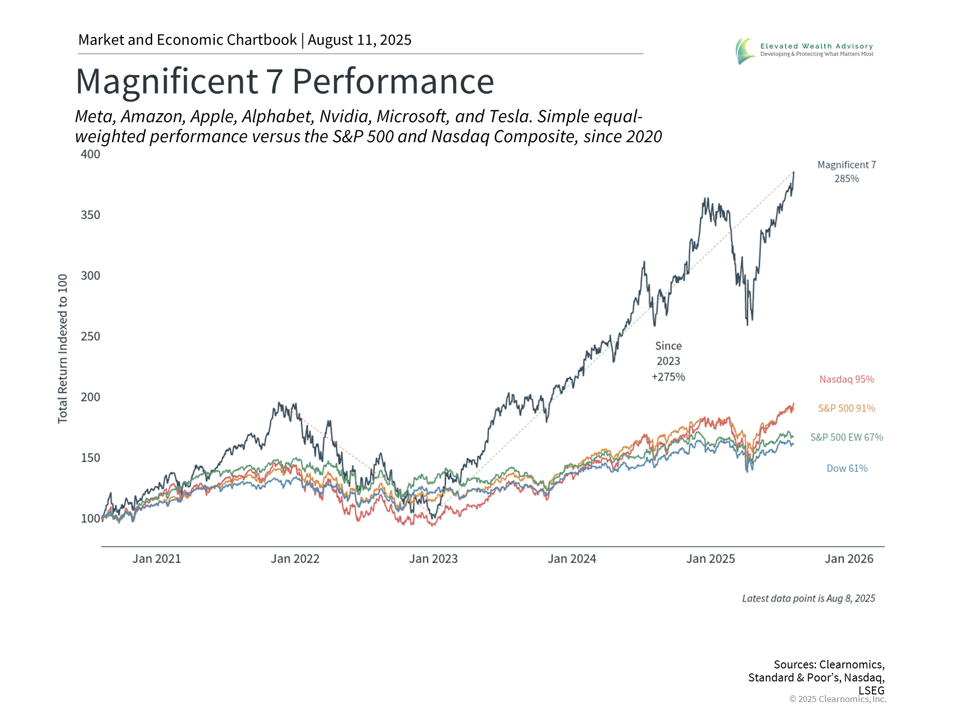 The challenge facing investors today isn't whether artificial intelligence will transform the economy, but how to maintain portfolio balance as the market climbs to new all-time highs. While it’s tempting to focus exclusively on companies that have performed well recently, investing for long-term goals requires a thoughtful approach to both growth and risk management. Mega-cap technology stocks, including those benefiting from AI trends, are commonly represented by a group known as the "Magnificent 7." These stocks - Apple, Microsoft, Nvidia, Amazon, Alphabet, Meta, and Tesla - now constitute about 35% of the S&P 500 and represent seven of the eight largest companies. Several are also referred to as “hyperscalers” due to their significant investments in computing infrastructure to meet the growing demands of AI applications. In market environments like these, when a relatively small group of stocks drives much of the market's performance, it becomes even more important to focus on historical perspectives, current valuations, and asset allocation. Understanding how similar periods of market concentration have played out in the past can help investors make better decisions about their long-term financial plans. Innovation drives markets in the long run