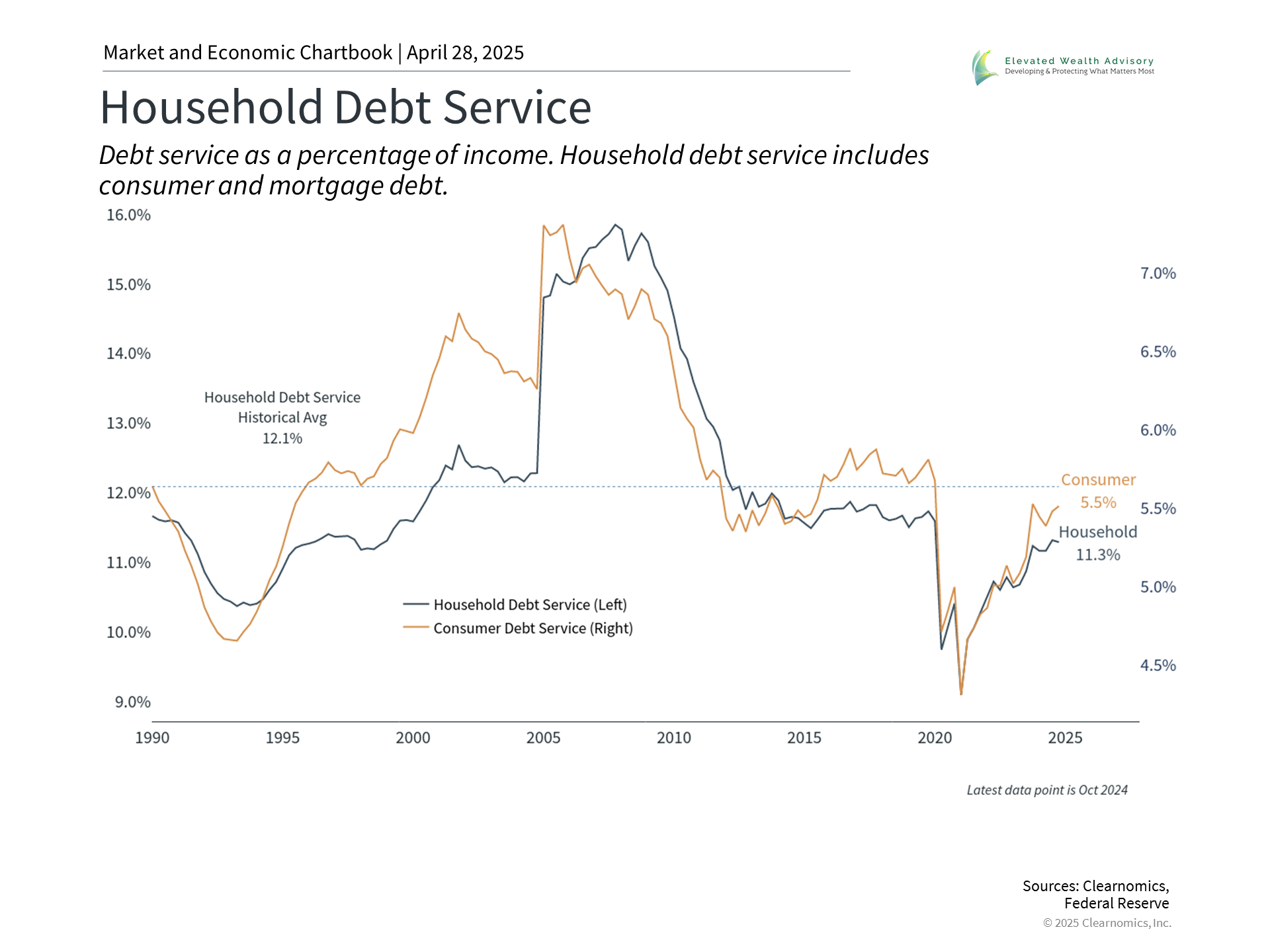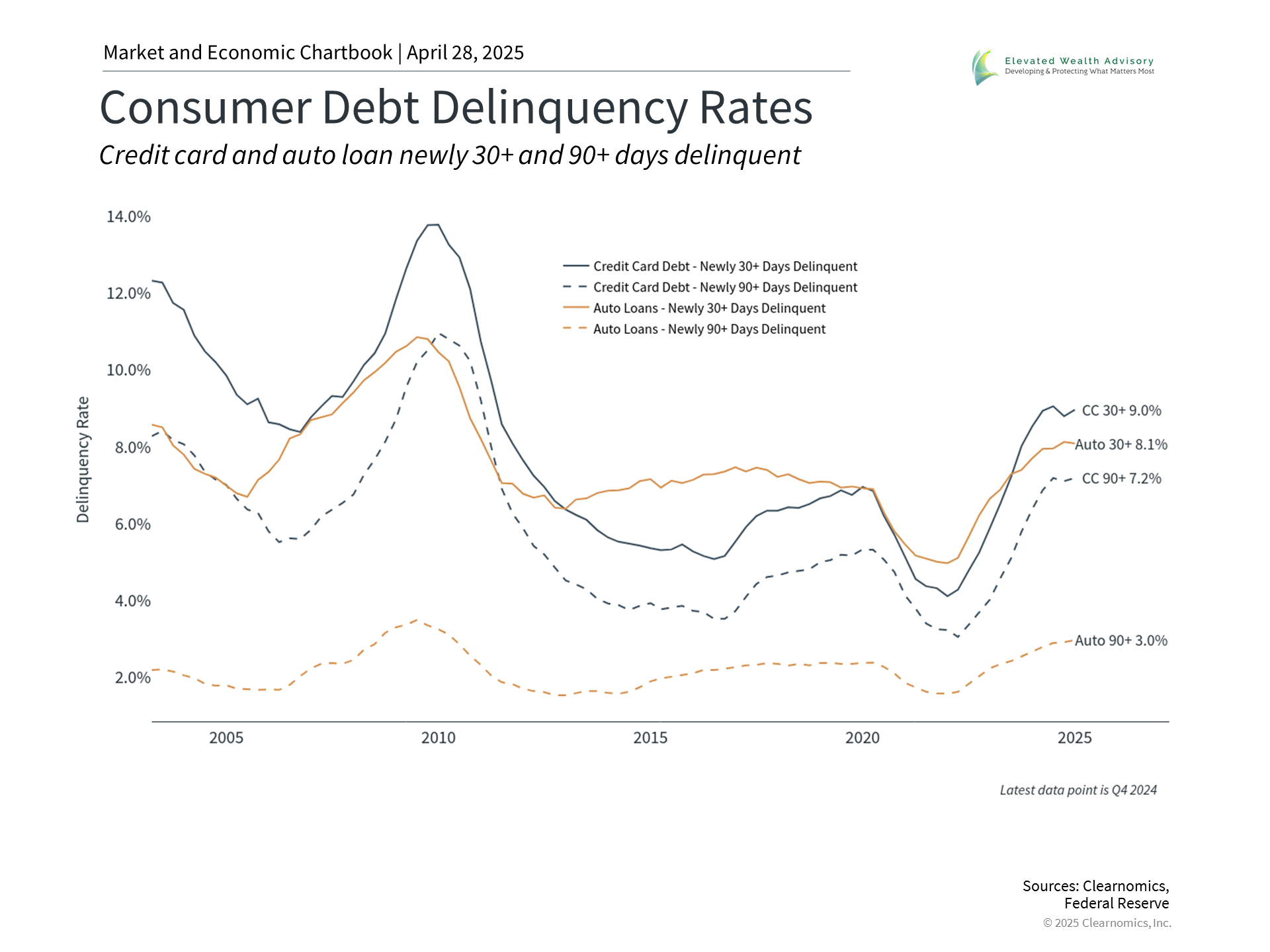 The financial health of consumers is an important indicator of the broader economy. Consumer spending represents about 70% of all spending across the economy, and steady purchases are one reason economic growth has exceeded expectations over the past few years. However, recent consumer weakness is a concern among investors worried about a possible recession. Recent headlines paint a picture of rising debt levels and late payments amid worries of inflation and slowing growth. At the same time, other economic data shows strong consumer balance sheets, record-high household net worth, and manageable monthly payments. This apparent contradiction has left many investors wondering which narrative to believe, and whether cracks are forming beneath the surface. The answer lies in understanding what economists sometimes call a “two-speed economy,” where financial situations vary across consumer segments based on income, wealth levels, credit scores, and more. While the financial challenges to large parts of the country should not be taken lightly, it’s important to separate what affects individuals and households from what impacts the stock market and portfolios. Consumer health indicators should be viewed as part of a more comprehensive picture that includes savings rates, debt service ratios, and overall net worth. This broader view helps explain why financial markets have remained relatively resilient despite these challenges. Late payments are on the rise