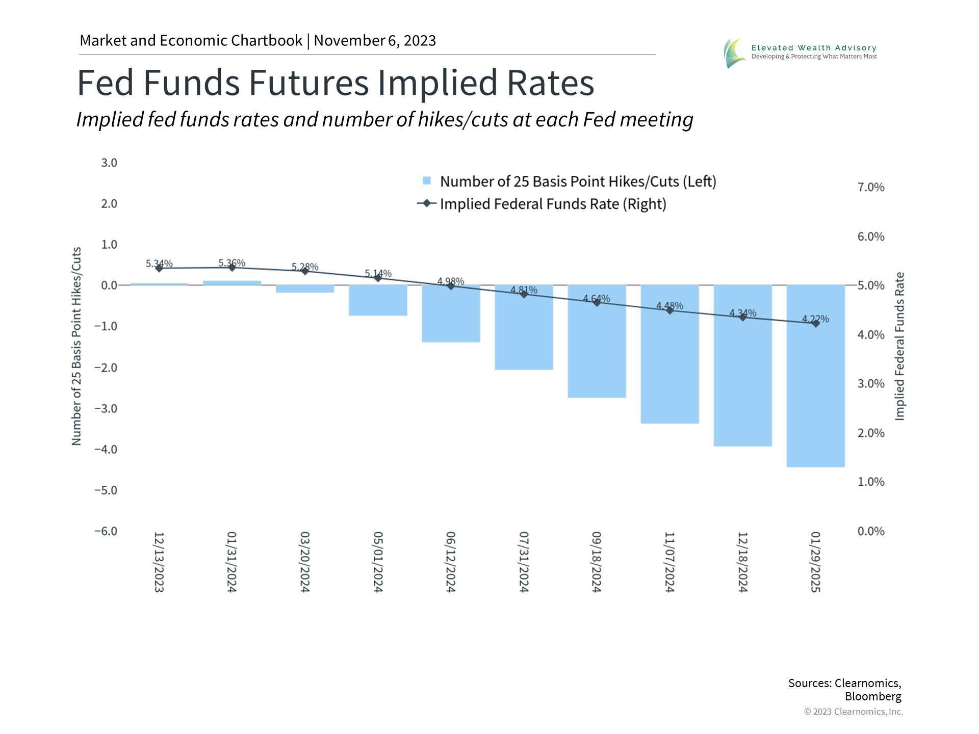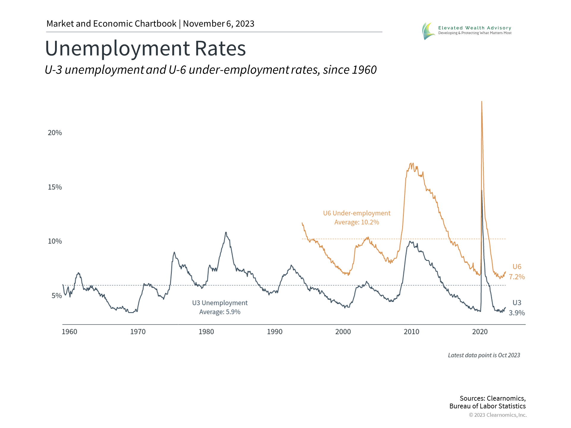 Holding rates steady is precisely what the Fed did again at its November meeting. The Fed recognized that there have been important improvements to the inflation story while the overall economy has been healthier than expected. A softer labor market reduces the risk that inflation could surge unexpectedly, and unemployment is approaching the Fed's 4% forecast for the end of the year. The Fed's ideal situation is that interest rates remain high across the yield curve to keep the economy in check without the need for additional rate hikes. This is not to say that market volatility is behind us - it never is, after all. On the contrary, it highlights that markets and investors often get ahead of themselves whether it's due to inflation, the Fed, financial stability in China, Washington politics, or dozens of other factors. In all of these cases, it's more important for investors to understand the bigger picture than try to react to every new headline. The bottom line? Investors should maintain a long-term perspective rooted in economic and market trends. Doing so is still the best way to increase the odds of achieving financial goals. | |||