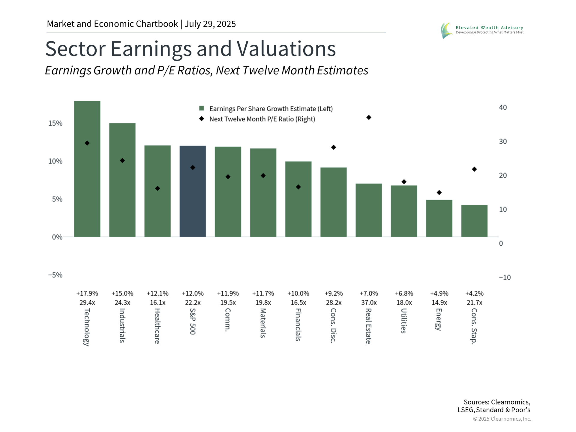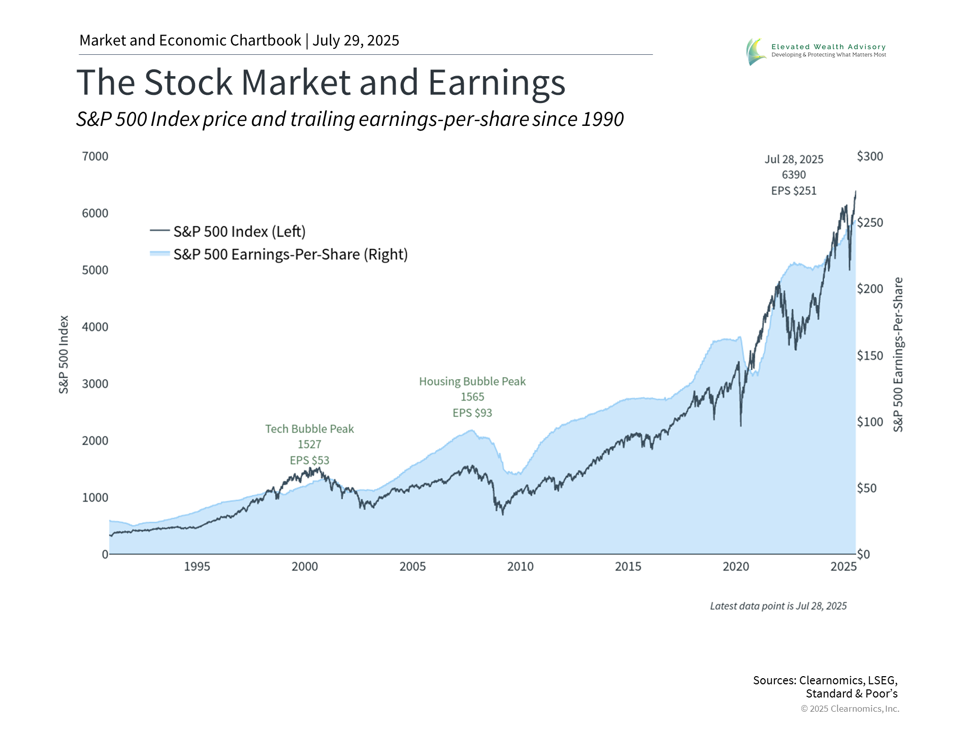 The stock market tends to follow corporate earnings in the long run. The accompanying chart shows that while the price and earnings of the S&P 500 do not line up perfectly, they follow the same broad trends. This is because economic growth boosts earnings, which in turn pushes stock prices higher. So, while the economy and the stock market are not one and the same, the two are closely related through the performance of companies. This is how the impact of tariffs on profits can affect investors. Whether the stock market is "cheap" or "expensive" depends not just on stock prices but also on corporate performance. The price-to-earnings ratio, for instance, is simply the price of a stock or index divided by some earnings measure, such as expected earnings over the next twelve months. What this means is that even if prices don't change, increasing earnings will make the market more attractive, and vice versa. The current S&P 500 price-to-earnings ratio is 22.2x, well above the historical average of 15.8x, and is approaching the historic dot-com bubble peak of 24.5x. Current earnings trends are positive, but whether the stock market continues to be attractive will depend on economic growth and earnings. The bottom line? The current earnings season could provide insights into the effect of tariffs on consumers and businesses. For investors, understanding these trends while staying focused on long-term planning are still the best ways to achieve financial goals. 1. https://budgetlab.yale.edu/research/state-us-tariffs-july-23-2025 2. https://insight.factset.com/topic/earnings 3. https://investor.gm.com/static-files/eaf4a73f-ef85-4134-8533-902e6a9a8177 4. https://www.clevelandcliffs.com/investors/news-events/press-releases/detail/678/cleveland-cliffs-reports-second-quarter-2025-results | |||