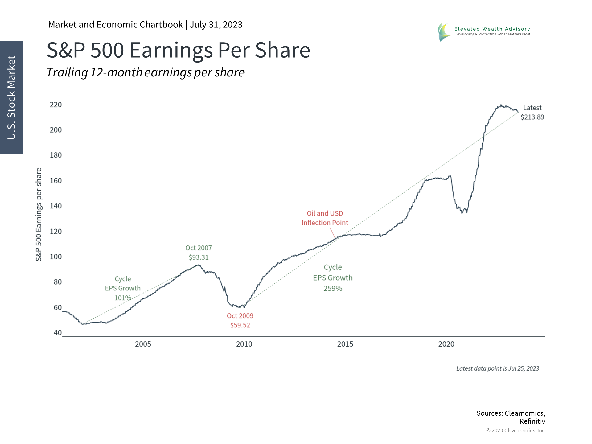 Second, it's not unusual for corporations to experience temporary profitability slumps. Recent earnings downturns occurred during the pandemic recession, in 2019 during a period of slowing growth, in 2015 and 2016 when oil prices collapsed, and many other periods. Today, this is due to the ongoing recovery in inflation and the various factors that are impacting each sector. Tech, for instance, has experienced sizable layoffs but also high demand for artificial intelligence-related hardware and tools. Financials are stabilizing after the banking crisis earlier this year and many of the largest diversified banks have benefited. Energy sector profits surged last year as oil prices jumped but this has turned around. All in all, eight of the eleven S&P 500 sectors are expected to experience positive earnings growth in the coming year. One reason for long-term investors to focus on corporate profitability is that earnings growth is a fundamental component of stock returns. By buying a company's stock, investors have the right to share in profits. The value of this right to shareholders depends on the growth in the company's earnings along with market valuations. Over the long run, steady earnings growth is what drives stock prices higher. In turn, earnings depend on economic growth and controlling costs, which is why trends among consumers, businesses, and inflation are so closely followed by long-term investors. Most sectors are expected to experience earnings growth