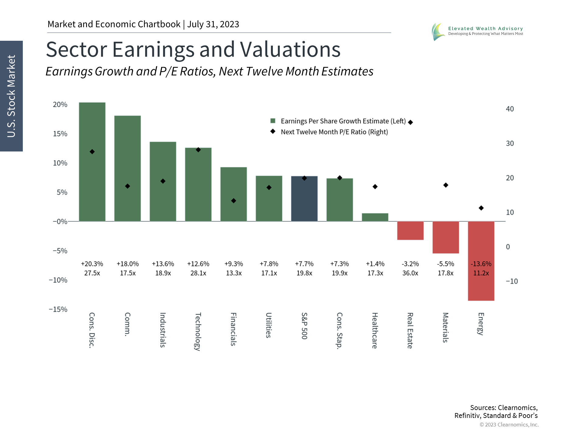 The recent GDP report for the second quarter showed that, adjusted for inflation, the U.S. economy grew at a healthy pace of 2.4% quarter-over-quarter. Not only was this better than many economists expected, but it represents an acceleration from last quarter's 2.0% growth rate. Despite experiencing two consecutive quarters of negative growth a year ago and the many recession forecasts at the start of the year, the economy is growing steadily. Among many factors, this is due to robust consumer spending and a rebound in business spending as households and corporations adjust to the inflation shocks of the past two years, as shown in the accompanying chart that breaks down the components of GDP. However, these improvements have not yet appeared in corporate profits. The corporate earnings season for the second quarter is halfway through and about 80% of S&P 500 companies are reporting positive earnings surprises while 64% have positive revenue surprises, all according to FactSet. However, this is due to very low expectations among Wall Street analysts. All told, blended earnings growth for the S&P 500 likely declined in the second quarter, making for the third straight quarter of falling profits. For the full year, 2023 will likely experience flat earnings growth. According to Refinitiv, the current consensus earnings-per-share estimate for 2023 is just under $214, compared to $215 last year. If this occurs, it will be disappointing given the 7.8% average earnings growth rates over the past four decades. Despite these challenges, there are two important facts to keep in mind. First, these same forecasts also anticipate an earnings recovery, possibly beginning in the fourth quarter. So, while growth in 2023 may be flat, growth over the next twelve months is expected to be a healthy 8%. Analysts also expect 2024 and 2025 to each generate 12% earnings growth. Although these numbers will likely come down, as they often do, this would be a healthy rebound after this year's earnings pause. Given the choppy economic environment over the past year and the rapidly changing conditions today, what happens over the next year should drive markets more than what's already in the rearview mirror. Earnings growth has stalled in 2023 but could rebound