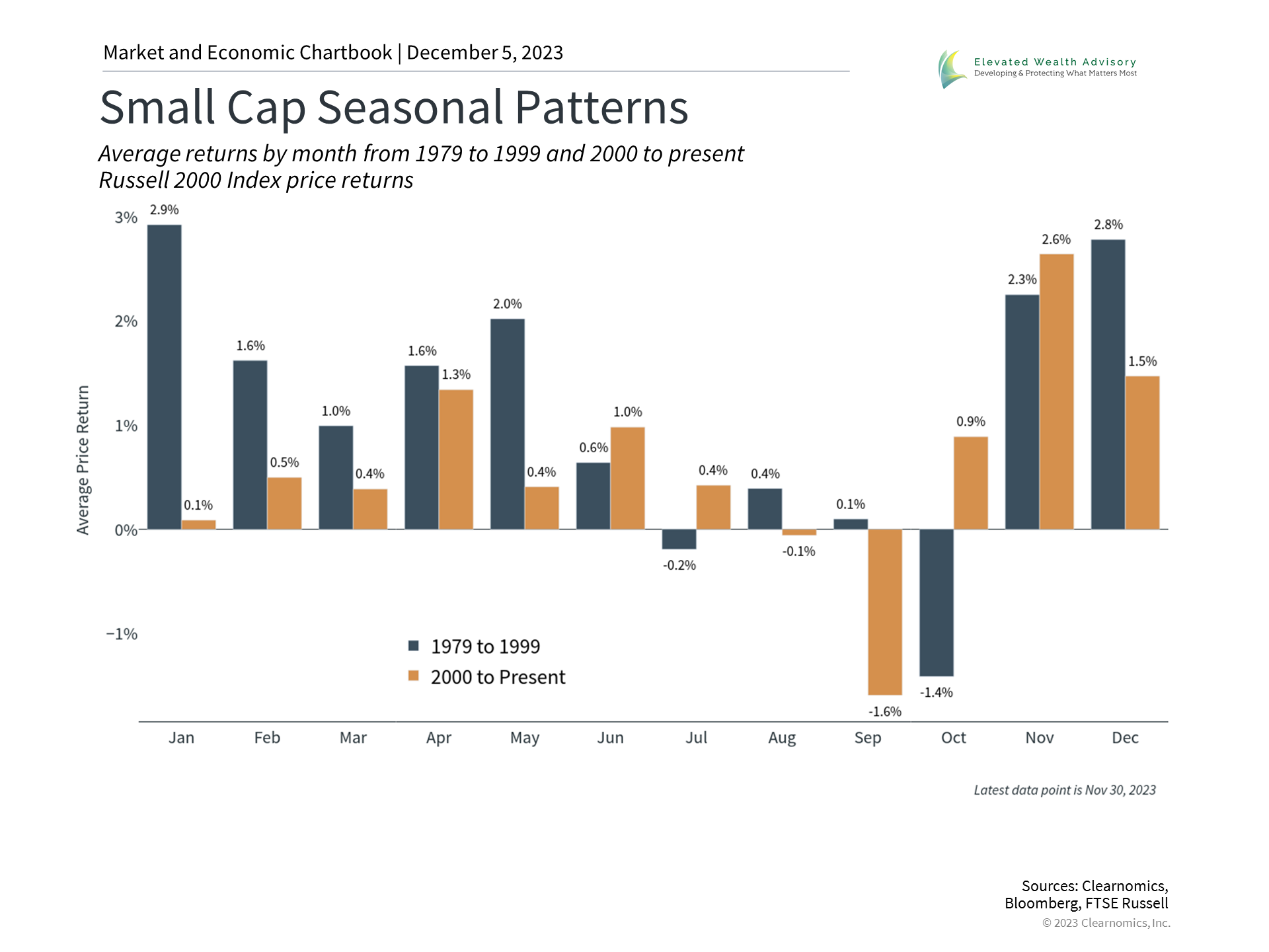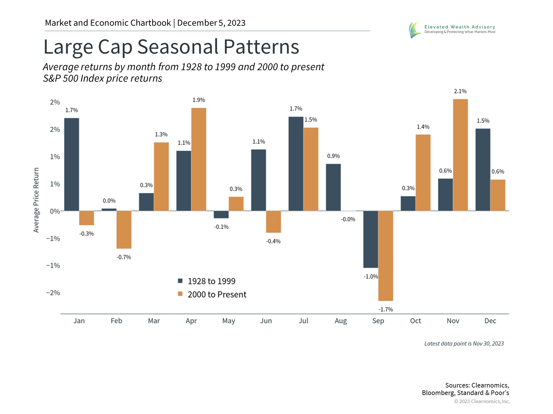 What does this mean for investors? Even when there is truth to surface-level patterns or seasonal effects, it's unclear what drives them or if they will continue. From a practical perspective, history suggests that it's better to focus on well-established drivers of markets which tend to operate over long time frames. The business cycle, corporate earnings, valuations, and other fundamental measures are not perfect predictors of market performance but they do tend to be correlated with returns over years and decades. The bottom line? Investors should remain focused on long-run trends rather than seasonal market patterns as they work toward their financial goals. | |||