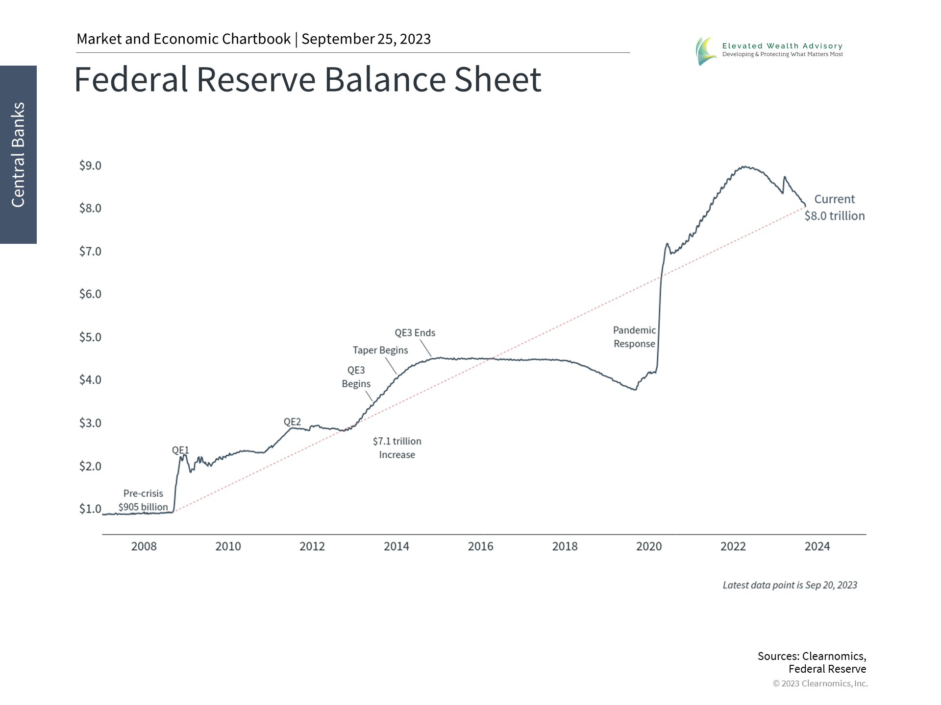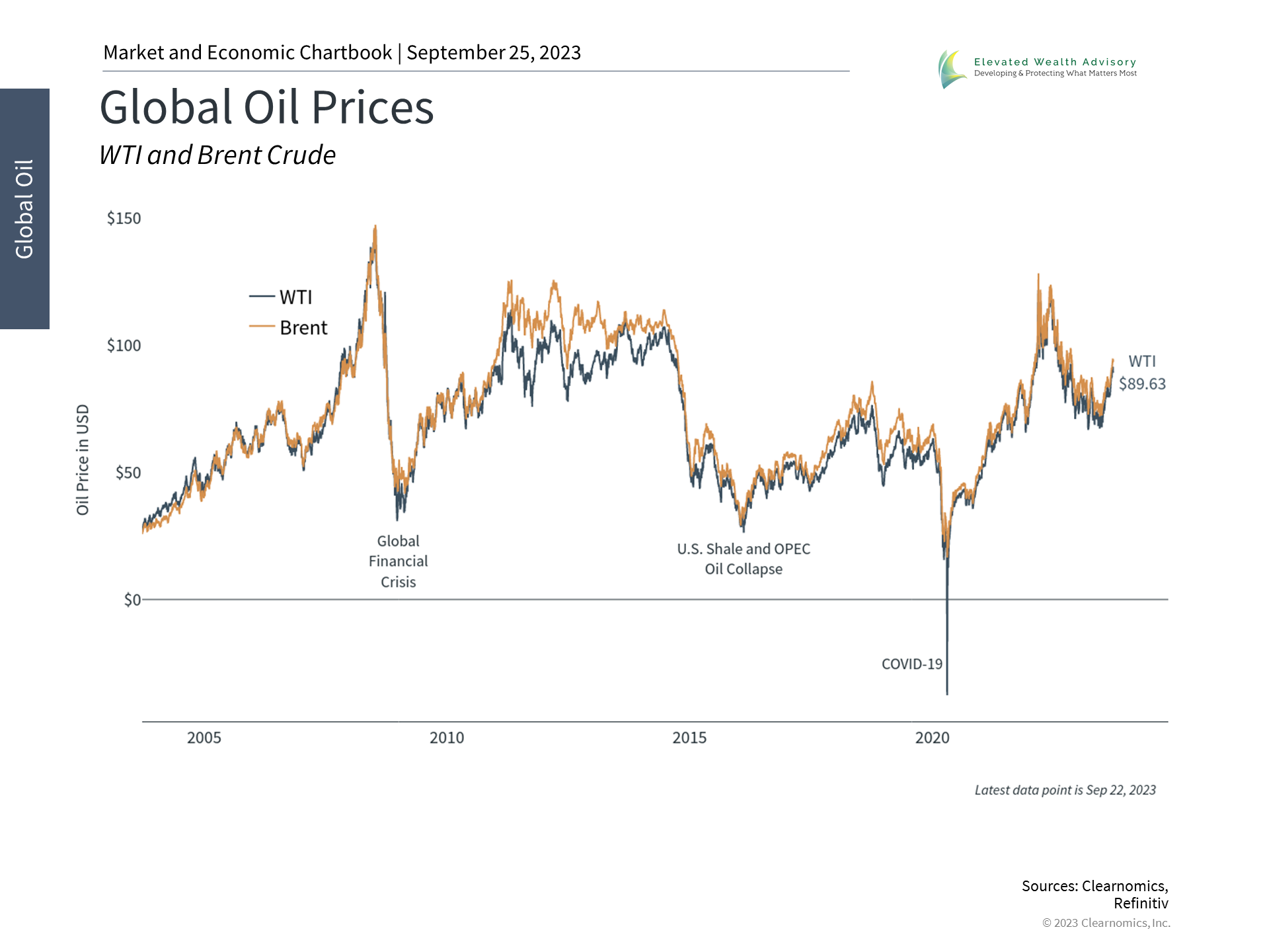 This is one reason that interest rates have jumped with the 10-year Treasury yield rising above 4.5% for the first in 16 years, acting as a drag on both stock and bond prices. Additionally, two other factors complicate the outlooks for policy and inflation, even if they don't undo the strong improvements of the past year. First, the Fed is not just raising rates but has also been shrinking its balance sheet, often referred to as "quantitative tightening." By not maintaining or increasing the size of its balance sheet, the Fed reduces the amount of liquidity in the system. Mechanically, the Fed is bidding on and buying fewer Treasury and mortgage-backed securities, potentially lowering their prices and raising their yields. In effect, this raises rates and tightens financial conditions. Thus, this has the opposite effect of the asset purchases the Fed employed during 2020 and throughout the 2008 financial crisis. Second, many signs of inflation still persist including higher rent prices, wage growth, and rising oil prices. In particular, oil prices that have jumped back to $90 per barrel and above may be worrisome since this was one of the original catalysts for higher headline inflation in early 2022. Similarly, wage growth around 4.5% year-over-year, while positive for households and consumers, can be problematic from an economic standpoint if this drives prices higher. This is especially true given the historic strength of the labor market. Oil prices have rebounded in recent months