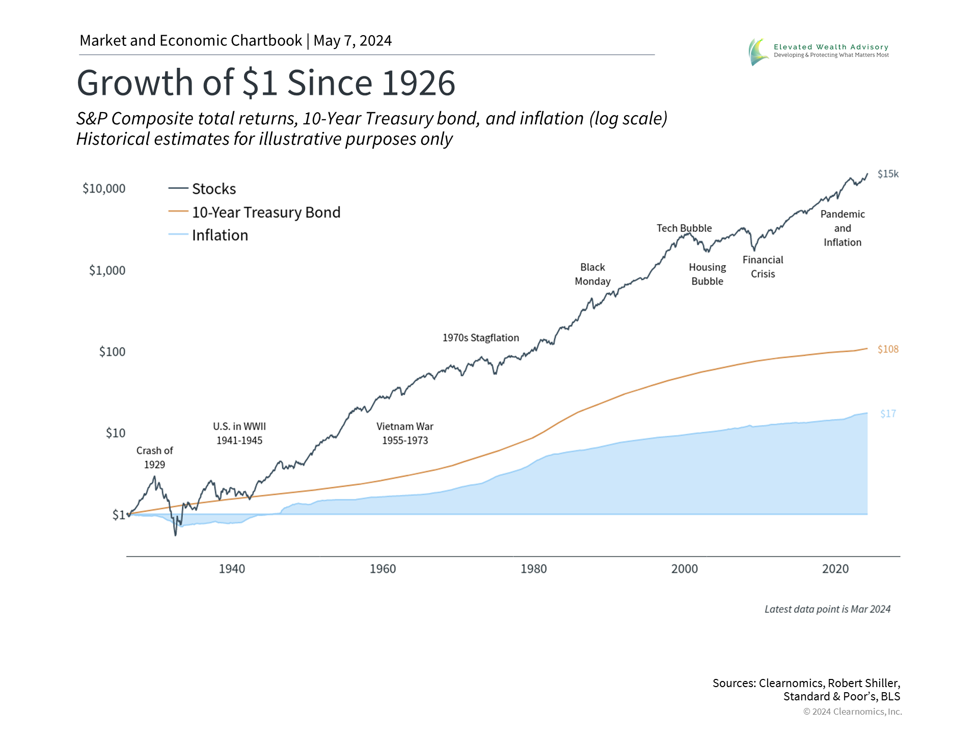 The prospects for cash will only worsen if the Fed does begin to cut rates later this year. Investors would be forced to reinvest their cash either at lower interest rates or in stocks and bonds whose prices would most likely have already risen. The possibility of falling rates has been an important driver of the overall stock market that will likely continue. The accompanying chart makes this opportunity cost clear. Due to inflation, what cost one dollar in 1926 now costs $17. However, the stock market has significantly outpaced inflation over long periods of time. A hypothetical one dollar investment in the stock market in 1926 would be worth over $13,000 today. A similar investment in long-term bonds would be worth $106, also outpacing inflation. Thus, while short-term investments can play important roles in financial plans and portfolios, it's critical in today's market environment to avoid holding cash for the wrong reasons. Market fear and high short-term rates have driven significant flows into cash and cash-like instruments. While these may make sense for short periods, history shows that they are not the foundation of long-term financial success. The bottom line? Investors should review their cash holdings as the stock market continues to rally and the Fed prepares to cut rates. In the long run, holding a proper allocation of stocks and bonds is still the best way to achieve financial goals. | |||