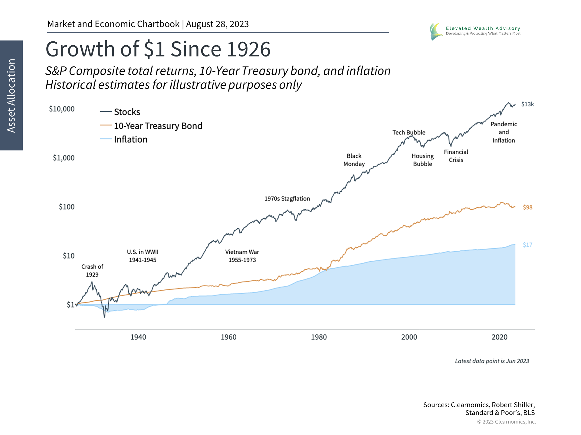 Staying financially disciplined has never been more important due to the sheer volume of noise from the media and the financial services industry. It seems as if headlines bounce from one concern to the next every week, with markets constantly swinging from exuberance to distress, as they have already done many times this year. For inexperienced investors and financial professionals alike, this can often be overwhelming. The reality is that this is nothing new. In 1979, for instance, the cover of BusinessWeek famously proclaimed "the death of equities" due to inflation - just as many did last year. In the short run, these assessments were correct as markets pulled back due to economic shocks and recessions. However, both the market and economy eventually recovered. Not only has the market experienced strong returns this year, recent volatility notwithstanding, but the past forty years since that magazine cover was published have been some of the best in history. This pattern plays out when looking back even further: the accompanying chart highlights the growth of $1 invested in 1926 in stocks and government bonds. Amazingly, a $1 stock investment almost a century ago would have grown to over $13,000 today despite the numerous challenges along the way. Even when invested in risk-free government bonds, the value of that dollar would have climbed to $98. In comparison, inflation has eroded the purchasing power of cash, with $17 now needed to buy what $1 used to. What this chart shows is that over this time frame, the stock market has created significant wealth for patient investors. However, bonds are also needed to smooth out the bumps along the way in order to preserve wealth. A proper asset allocation that takes advantage of both asset classes, and possibly many others, is the best way to navigate turbulence while positioning for long run growth. (Please note that this chart uses a "logarithmic scale" to highlight the comparison between stocks, bonds, and inflation. If shown on a linear scale, the steepness of the stock market line would be even more dramatic.) Saving early can have a significant impact on portfolio values