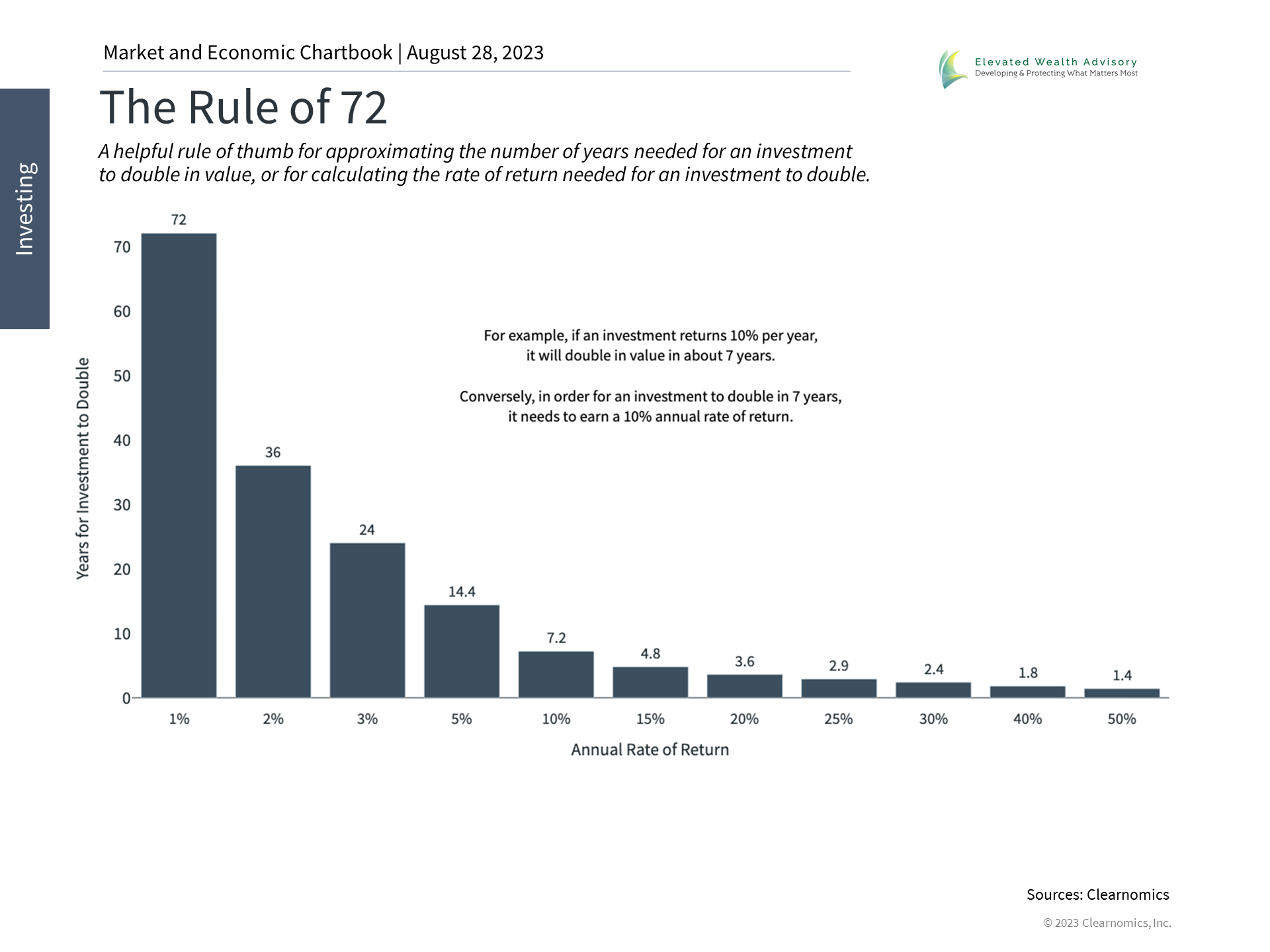 This is because the compounding nature of investments can only work if there is sufficient runway. Given enough time, not only do investment returns add to a portfolio, but those returns generate their own returns, and so on and so forth. In this way, compound interest is what creates true wealth for investors over long periods of time. The rule of 72 is a simple way to understand this compounding effect. It is a rule of thumb that estimates how quickly a rate of return would lead to a doubling of a portfolio, or similarly, what return is needed to double a portfolio in a certain amount of time. For example, with a 5% to 10% annual rate of return - a range consistent with long run historical returns - a portfolio would double in 7 to 14 years. Thus, starting early creates more opportunities to benefit from this effect. Of course, while the rule of 72 is based on pure arithmetic, markets can vary wildly on a week-to-week or month-to-month basis. The bottom line? While investors should understand and maintain perspective on the market and economic environment, it's equally important to invest early and stay invested through challenging times. History shows that this is the best way to achieve long-term financial goals. | |||