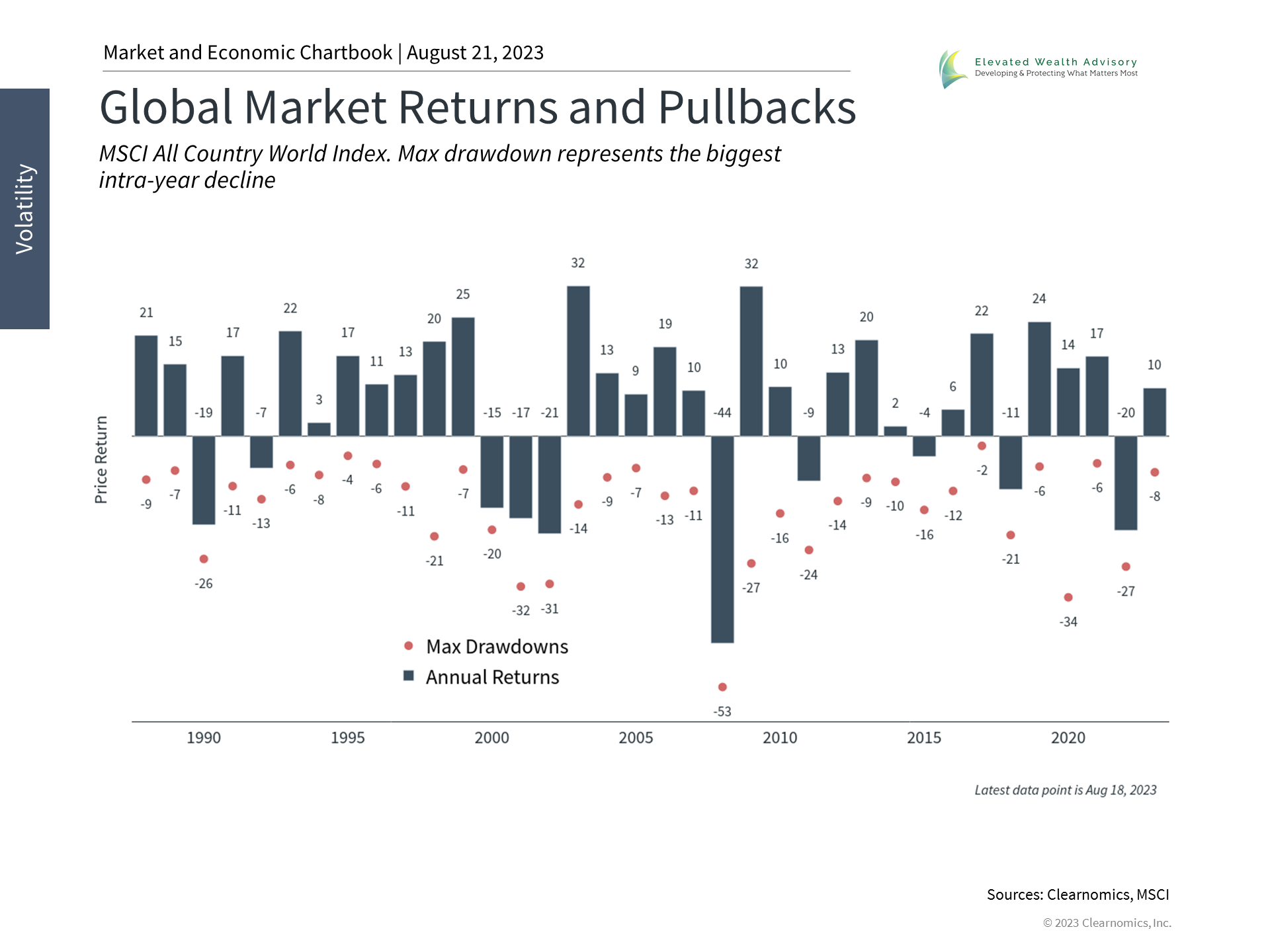 While investors may be concerned about these issues and their repercussions across markets, these risks are exactly why investors are rewarded in the long run. Despite recent market volatility, emerging markets have contributed significantly to diversified portfolios over the past twenty years. Investing in China and EM requires accepting a large degree of uncertainty but this is ultimately what drives long run returns. The chart above shows that global markets, which includes the U.S., developed international, and emerging markets, can experience significant intra-year declines. Despite this, most years experience positive returns, benefiting those with the fortitude to stay invested. Thus, while every market pullback is challenging and each new situation feels unique, the reality is that diversified portfolios tend to stabilize and recover regardless of the underlying causes. Rising rates are a headwind for markets, just as they were last year. The problems in China are large in scale, but investors have been watching closely for signs of trouble for over a decade. Understanding these events, while not overreacting to every headline, is the key to maintaining balance and focusing on long-term financial goals. The bottom line? Investors ought to maintain perspective and stay diversified through periods of market uncertainty, whether due to rising rates, China, or other concerns. | |||