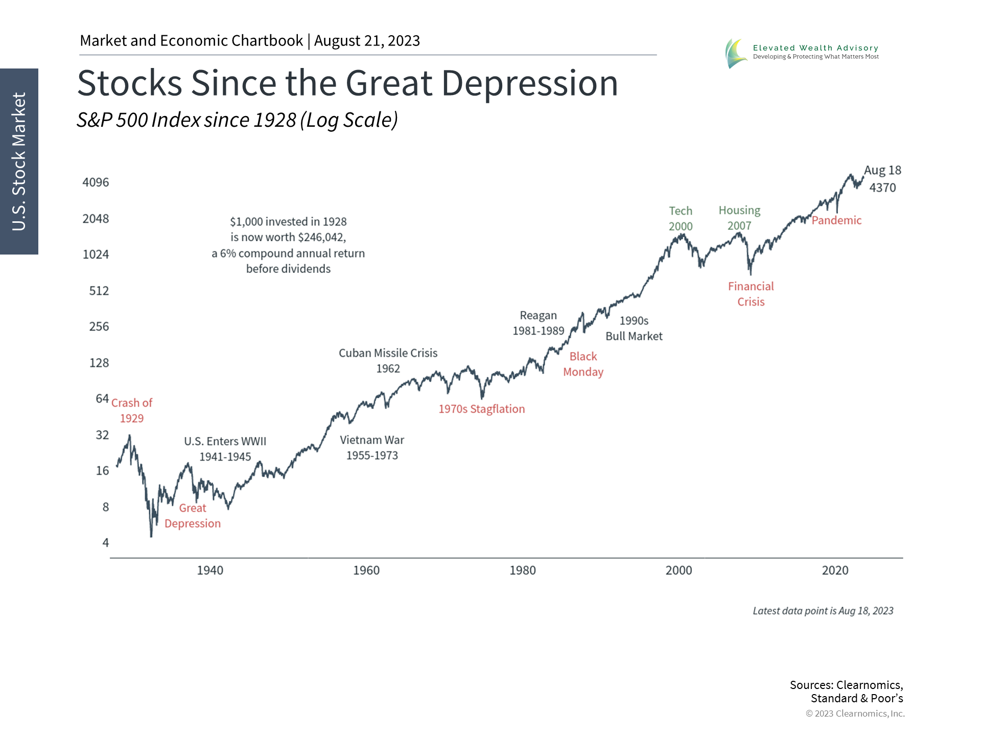 A perennial challenge for investors is distinguishing short-term issues from long-term trends. This is because, when it comes to investing, there are always reasons to be concerned. The last several years have been a parade of negative headlines including trade wars, the pandemic, supply chain problems, inflation, geopolitical risk, elections, debt ceilings, banking crises, bear markets, and many more. Even when these worries are resolved - or when they fall out of the news cycle - they are always replaced by seemingly more urgent issues. Unfortunately, it appears to be human nature for investors to constantly shift focus from one set of problems to another, creating an endless hamster wheel of anxiety. Despite this, financial markets have experienced many periods of strong returns, especially when considering longer time frames. As the accompanying chart shows, the market trend over the past century has been one of long-term wealth creation driven by economic growth and technological advancement. Zooming in, there are countless periods during which investors grappled with wars, recessions, financial crises, and other once-in-a-generation issues. But even when the market stumbled, the new lows were often higher than prior peaks. With the benefit of hindsight, those who were saving for goals such as retirement, buying a home, or college, would have been best served by focusing on years and decades, not months and quarters. This perspective matters because the market is once again experiencing a period of volatility after a robust rally. What are the primary sources of concern today? First, interest rates have jumped over the past month. The 10-year Treasury yield has risen above 4.25%, the highest level since 2007. This has coincided with events such as Fitch Ratings downgrading U.S. Treasury securities and Moody's downgrading many banks. This has forced other interest rates higher, including the average 30-year mortgage rate which is now above 7%, the highest since 2000. Just as they did last year, rising rates have acted as a headwind on the broader stock market and tech stocks in particular. Many of the best performing tech stocks, which also happen to be the largest stocks in the S&P 500, have struggled as a result. Some company-specific factors, such as weaker-than-expected earnings due to softer demand, have acted as a drag as well. These rate moves could also have a mixed impact on the economy. Higher long-term rates tend to slow the economy by increasing the cost of capital. At the same time, the yield curve has steepened which may be viewed as positive, especially if it helps to slow inflation further. Despite how some investors may feel, the stock market has been calm