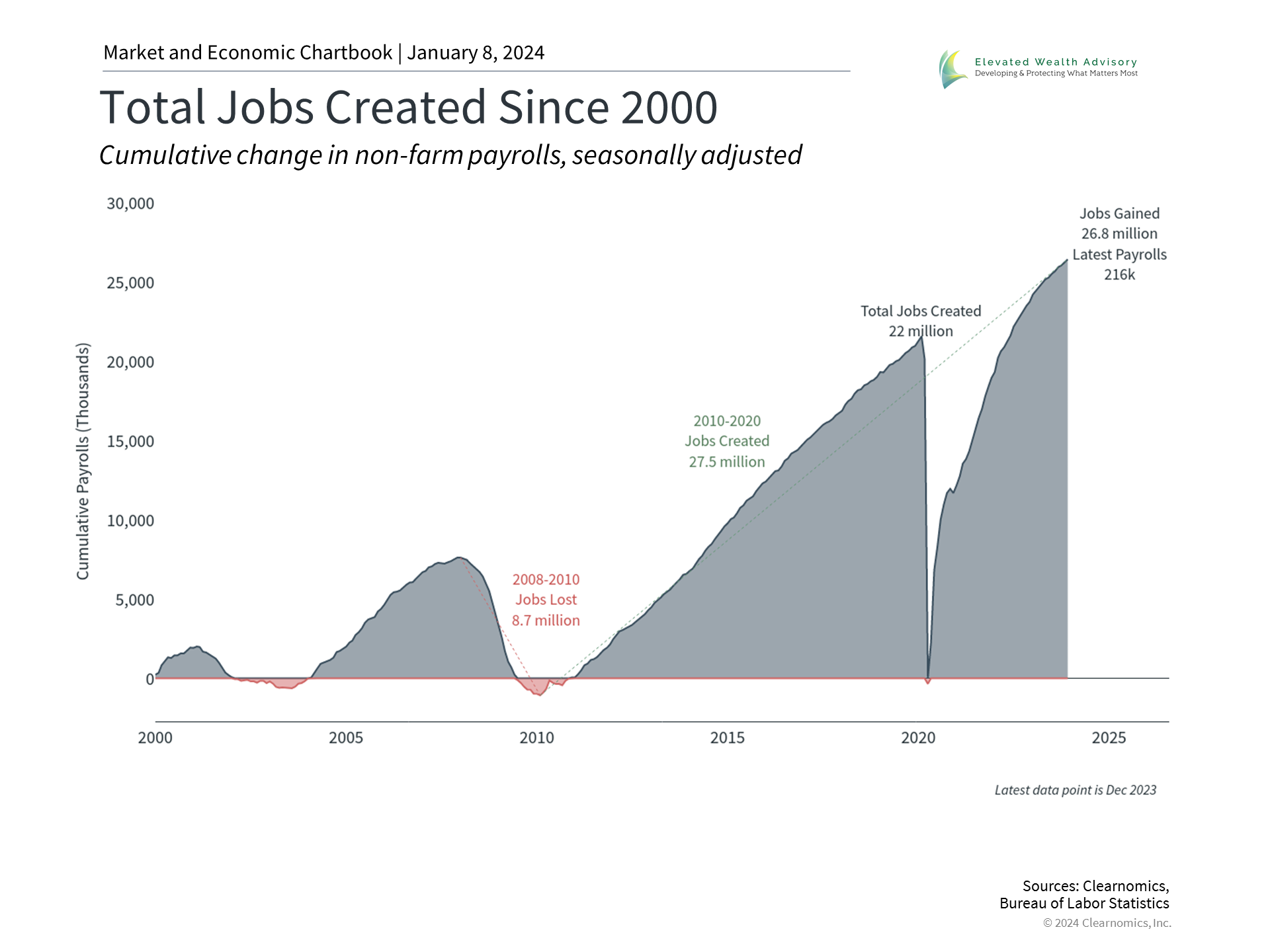First, it's important to define what a soft landing entails. The Federal Reserve's Congressional mandates since 1977 have been to maintain stable prices (i.e., keep inflation low) and achieve maximum employment (i.e., keep the economy strong). From 2008 following the global financial crisis to early 2020, inflation was exceptionally low, allowing the Fed to keep policy rates near zero for much of that decade. The inflation spike of the past few years reversed this trend for the first time since the early 1980s, resulting in one of the fastest rate hike cycles in history. Since rising rates tend to slow the economy, the Fed's challenge has been to tighten policy in a way that slows inflation without causing a deep recession. The probability of a soft landing increased last year as the economy remained robust even as inflation fell. The Fed has traditionally maintained a 2% inflation target on the Personal Consumption Expenditures Price Index, a measure of inflation, and these figures have now decelerated to 2.6% and 3.2% on the headline and core measures, respectively. Absent any major shocks to the economy, energy prices, or rents, these figures could be on track to reach 2% on a year-over-year basis later this year. Recent month-over-month numbers have been significantly lower with the latest figures showing a decline in prices. Last week's jobs data also showed that the labor market has slowed but remains historically strong. Unemployment was steady at only 3.7% and 216,000 new jobs were added in December, although there were also 71,000 in downward revisions to the prior two months. Still, this means that 2.7 million new jobs were created in 2023, an exceptional pace that adds to the cumulative job gains shown in the accompanying chart. The economy is expected to slow but few expect a deep recession this year