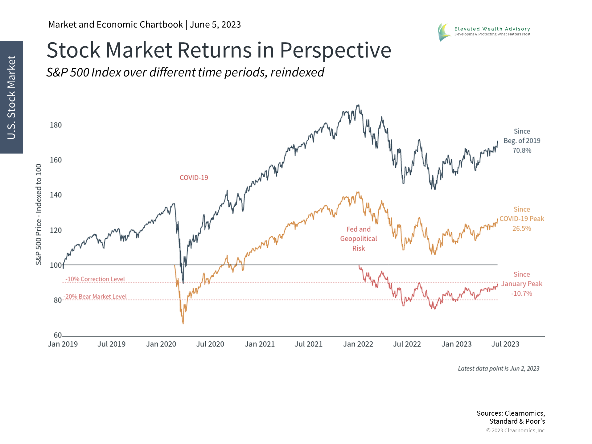 Investor sentiment tends to swing from one extreme to the other. At the start of the year, many investors and economists were certain there would be a recession within months that would result in higher unemployment and Fed rate cuts. As we approach the second half of the year, no recession has yet materialized, and many economic trends have surprised to the upside. Headline inflation measures have improved although core inflation remains stubborn. Interest rates have stabilized with the 10-year Treasury yield hovering around 3.7%, partly due to a possible Fed pause at an upcoming meeting. These factors have helped tech stocks rebound, especially in areas related to artificial intelligence. This has driven a divergence between sectors this year with Information Technology and Communication Services returning 36% and 34%, respectively, and Energy, the top performer last year, declining 9%. Despite the strong market gains this year, it's unlikely that investors feel comfortable in the current environment. There is always something new to worry about, a concept often referred to as the "wall of worry." The wall never shrinks - new building blocks are continually added as investor focus and media coverage shift to the next set of worries. A focus on day-to-day headlines naturally leads investors to have a glass-half-empty view. After all, current events tend to dwell on unexpected negative events, rather than on the steadier, less noticeable progress that drives stock market returns over years and decades. Today, this short-termism reminds investors that major indices are still in the red when compared to last year's all-time highs, and that many thorny market and economic issues are still unresolved. This is why it's often important to view the market with a broader perspective. The glass-half-full view, which is much more appropriate for long-term investors, is that many of these issues are slowly improving. As a result, the market has risen 21% from last year's market bottom, and 71% since the beginning of 2019, despite all of the intervening events. These are figures that everyday investors would likely be unaware of if they only followed the day-to-day headlines. The economy continues to grow despite recession fears