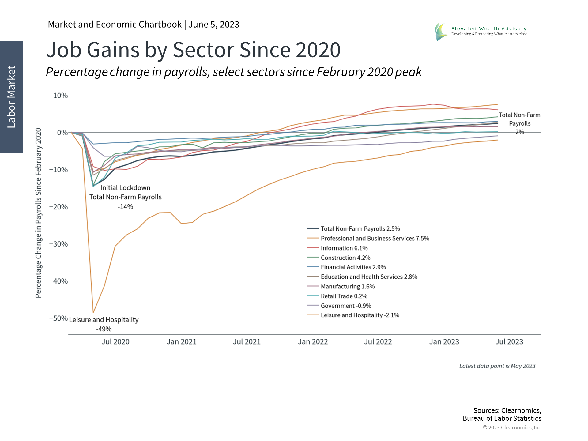Of course, this is not to say that markets only go up or that there is never anything to worry about. Instead, these facts are a reminder for investors to stay disciplined, in both good and bad markets, and to stick with their financial plans. Just as pilots often remind passengers to keep their seatbelts fastened even when the air is calm, periods of positive market performance are the best times for investors to stay balanced and prepare for future uncertainty. The latest data confirm that the economy is doing better than many feared just a few months ago. Despite what economic theory would predict, Fed rate hikes have had little impact on the labor market so far. The recent jobs report showed that 339,000 new positions were created last month, many more than forecasted. Unemployment did tick up to 3.7%, but it has been fluctuating around these levels since last August. What's more, recent data also show an increase in the number of job openings back above 10 million across the country. Thus, despite recession concerns and shocks such as tech layoffs and the failure of a few mid-sized banks, there are still 1.7 job openings for each unemployed person. Getting invested is often better than trying to time the market