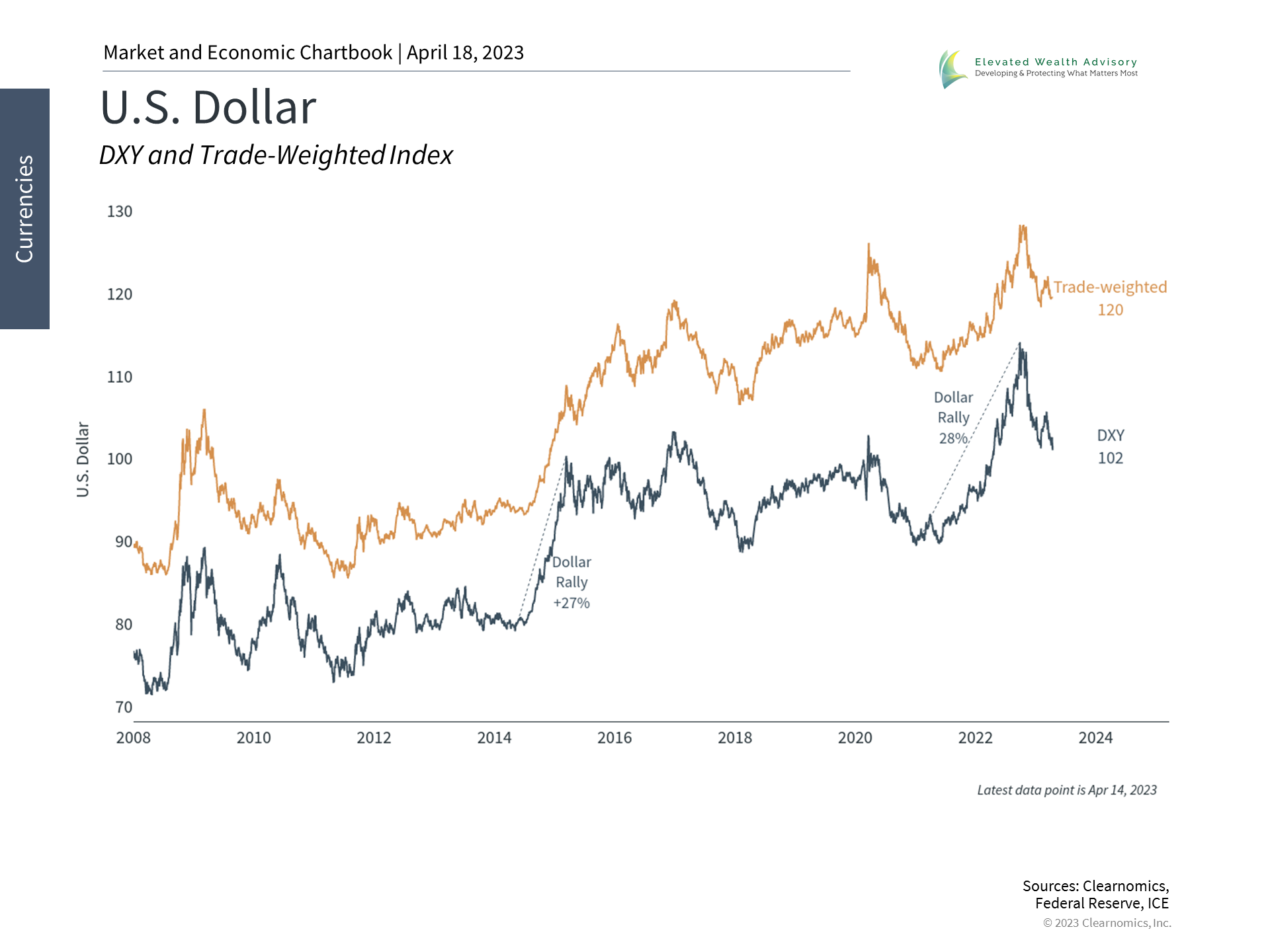 These numbers put into perspective the latest headlines around several emerging market countries, known collectively as the BRICS nations, that plan to increase competition with the dollar. These countries, of which China is the largest, established the Shanghai-based New Development Bank in 2014 as an alternative to the World Bank and the IMF. While this may help reduce these countries' reliance on the dollar in some areas of trade and in foreign debt, it does not solve the underlying need for a currency that is stable and trusted globally. A case in point is that during times of stress, investors often flock to the dollar as a safe haven asset. Even as inflation began to rise in 2021, which would normally weaken a currency, the dollar rallied due to the robust U.S. economic recovery compared to the rest of the world and the prudent tightening of monetary policy by the Fed. The dollar even reached parity with the euro last year for the first time since 2002. So, while the rise of China in the geopolitical and economic spheres should not be underestimated, this does not mean that the dollar will be supplanted overnight. While Americans do benefit from a trusted dollar, what's important is that the dollar is trusted globally because of the vibrancy and strength of the U.S. economy. After all, the dollar is not backed by gold but by the "full faith and credit" of the U.S. government. Thus, the dollar reflects expectations around the prudent management of the economy, geopolitical issues, inflation concerns, and many other factors. When it comes to investing, there are three key ways in which the value of the dollar will continue to impact portfolios, regardless of the role of the dollar. First, the importance of the dollar doesn't tell the whole story since having a currency that is too strong can be problematic if it makes U.S. goods and services more expensive to the rest of the world. In other words, a stronger dollar can make it more difficult for U.S. companies to compete abroad, reducing profitability. Around 2015, a surging U.S. dollar resulted in an "earnings recession," driven also by the fact that the share of international revenue for U.S. companies has increased over time. Thus, having the dollar at a sensible level is often better than a dollar that is too strong. Fortunately, the dollar has backed away from its recent peaks with the dollar index (DXY) declining from around 114 to 102 in recent months. A weaker dollar is a tailwind for international investments